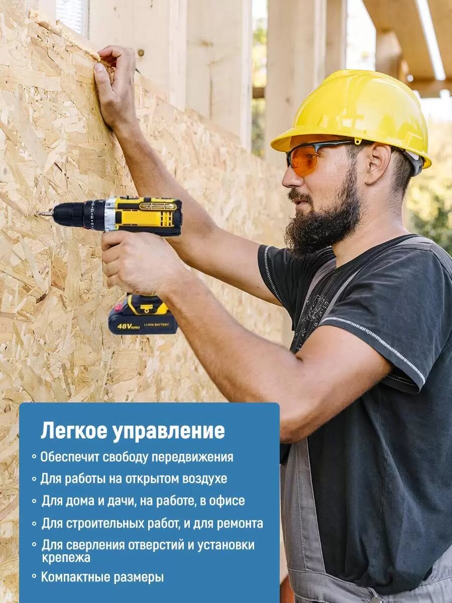 Дрель-шуруповерт желтый с двумя аккумуляторами 2А, с набором и кейсом в комплекте интересное:
