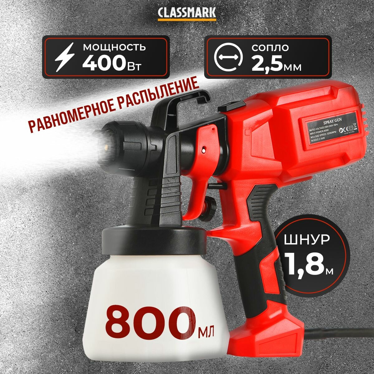 Краскопульт Classmark, электрический, HVLP, 400Вт, бачек 800мл интересное: