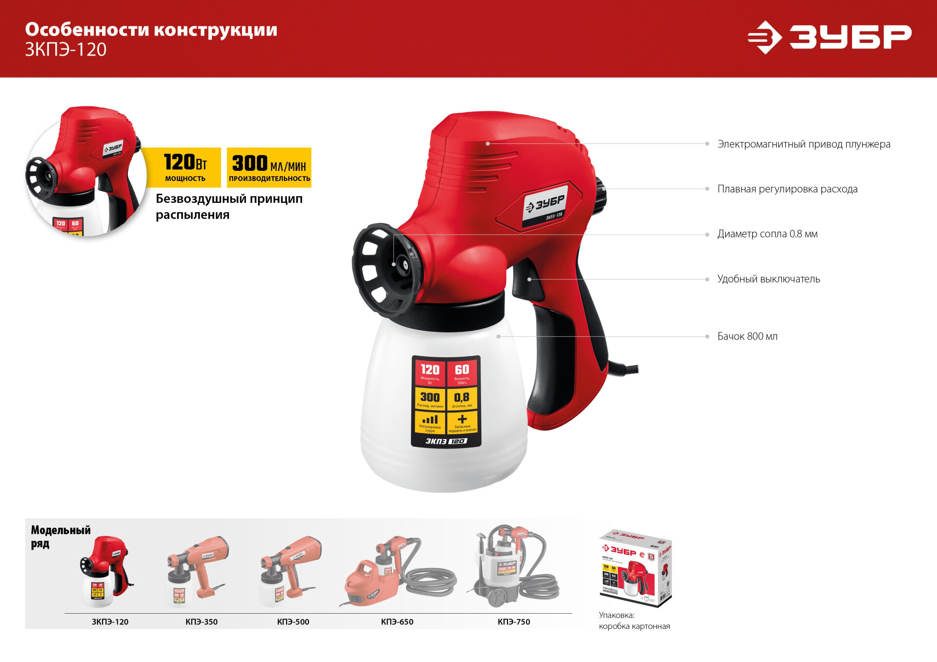Краскопульт ЗУБР ЗКПЭ-120, 120Вт, 0.8л, плунжерный, безвоздушный, 300мл/мин, сопло 0.8мм интересное: