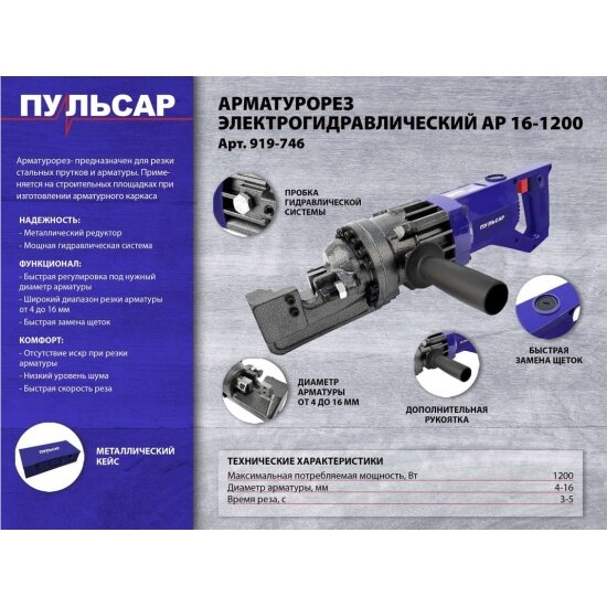 Арматурорез Пульсар АР 16-1200 (1200 Вт, арматура 4-16 мм, кейс, 12 кг) интересное: