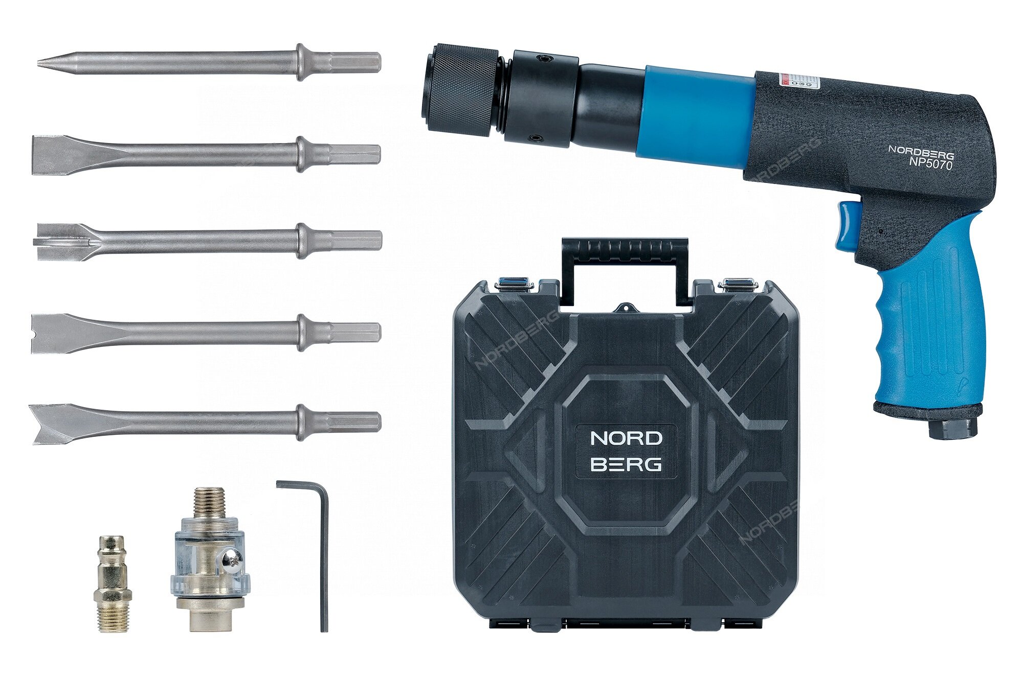 Купить Пневмозубило с шестигранным хвостовиком, 250 мм с комплектом насадок и быстросъемным держателем в кейсе NORDBERG / Зубило пневматическое