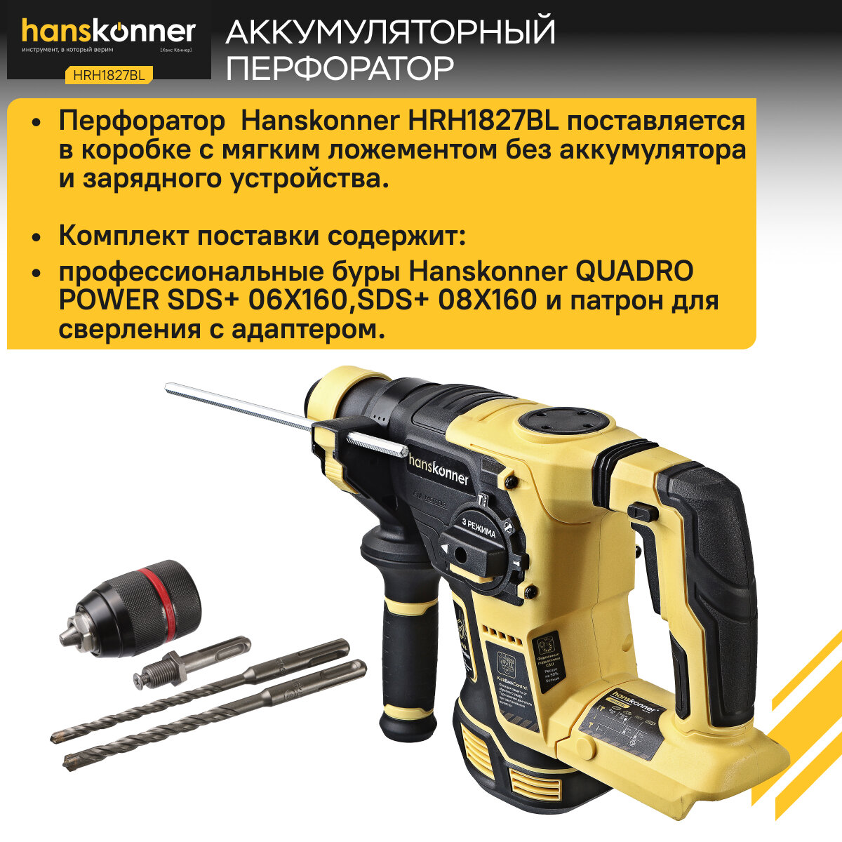 Перфоратор аккумуляторный HANSKONNER HRH1827BL PLATINUM, 18В, 1BatterySystem, б/щ , 4 Дж, 3 режима, без АКБ и ЗУ интересное: