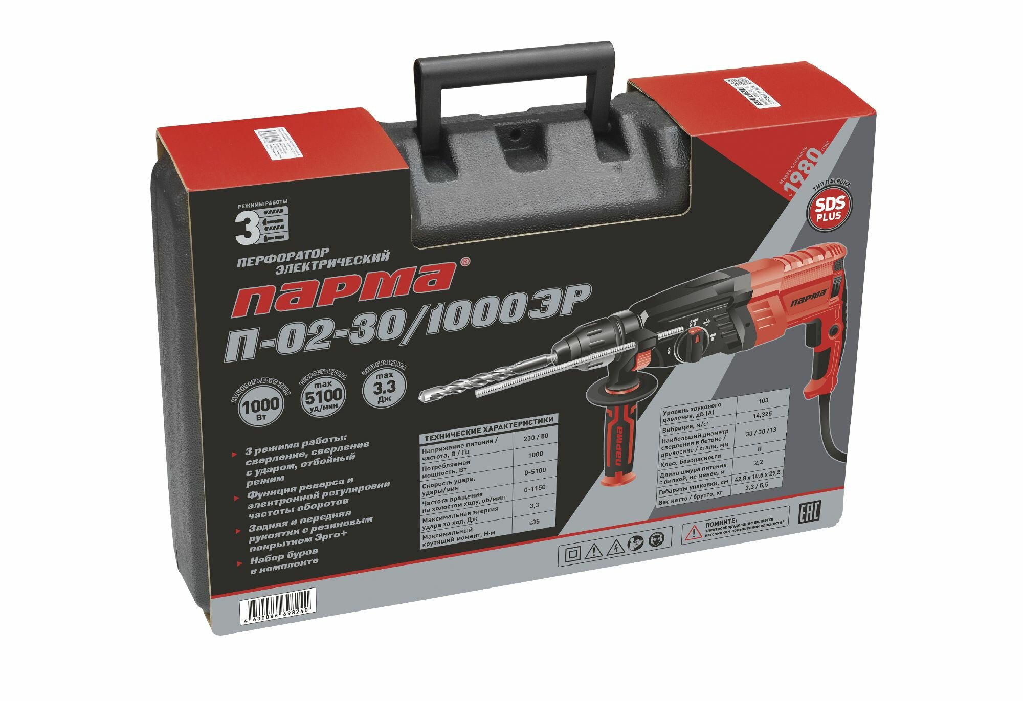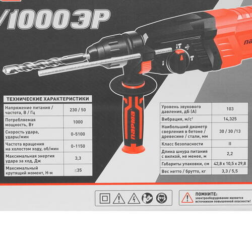Перфоратор Парма П-02-30/1000ЭР патрон: SDS-plus уд:3.3Дж 1000Вт (кейс в комплекте) интересное: