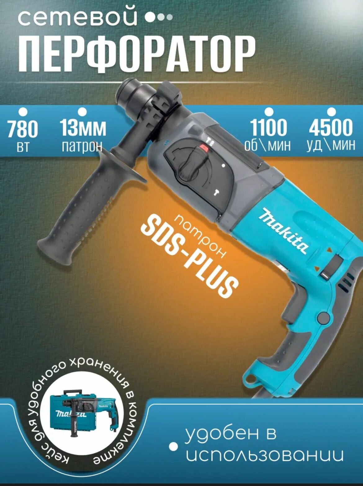Перфаратор строительный Makita SDS-Plus, без аккумулятора, мощность 780 Вт, горизонтальный двигатель интересное: