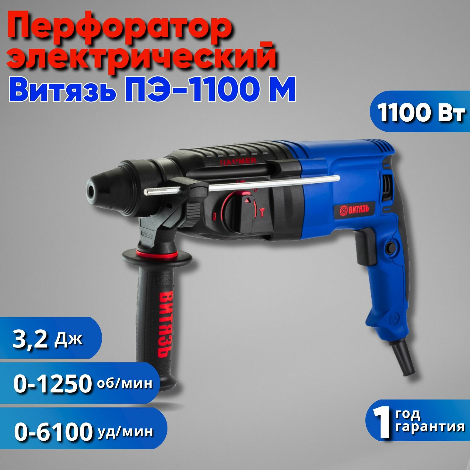 Купить Перфоратор электрический Витязь ПЭ-1100м, 3.2 Дж, SDS +(Пика, Зубило, Дополнительный патрон)