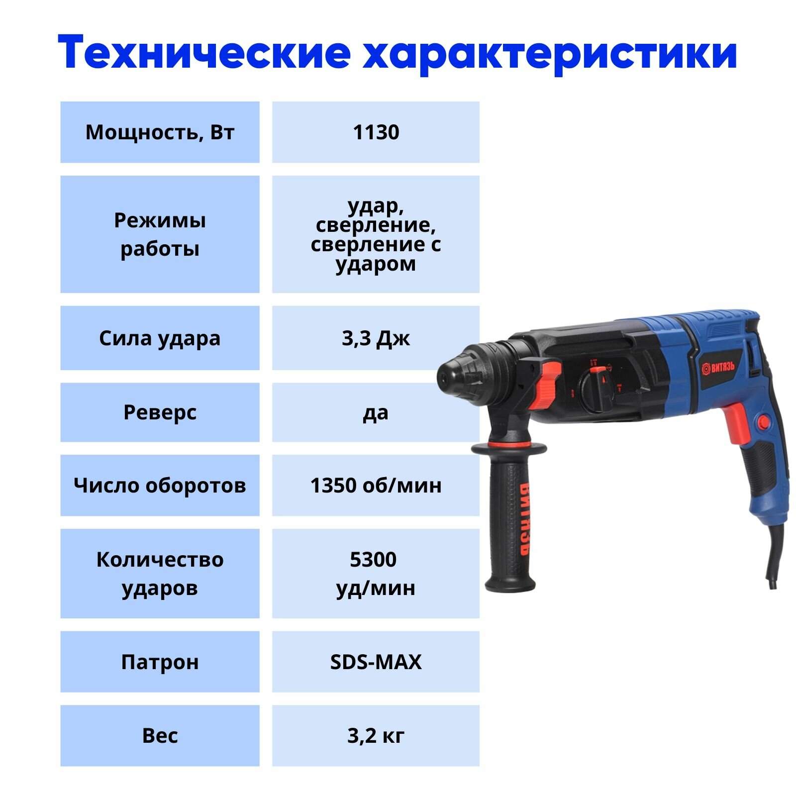 Перфоратор электрический Витязь ПЭ-1130, SDS-Plus, 3Дж, реверс (кейс, 3 бура, пика, зубило) интересное: