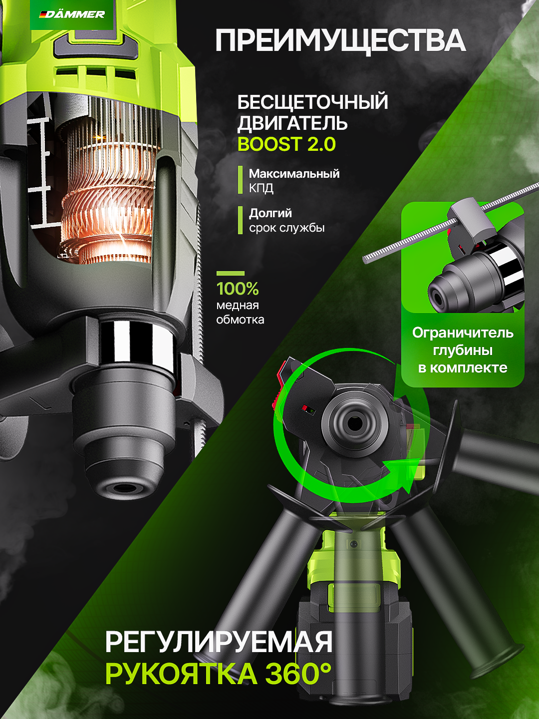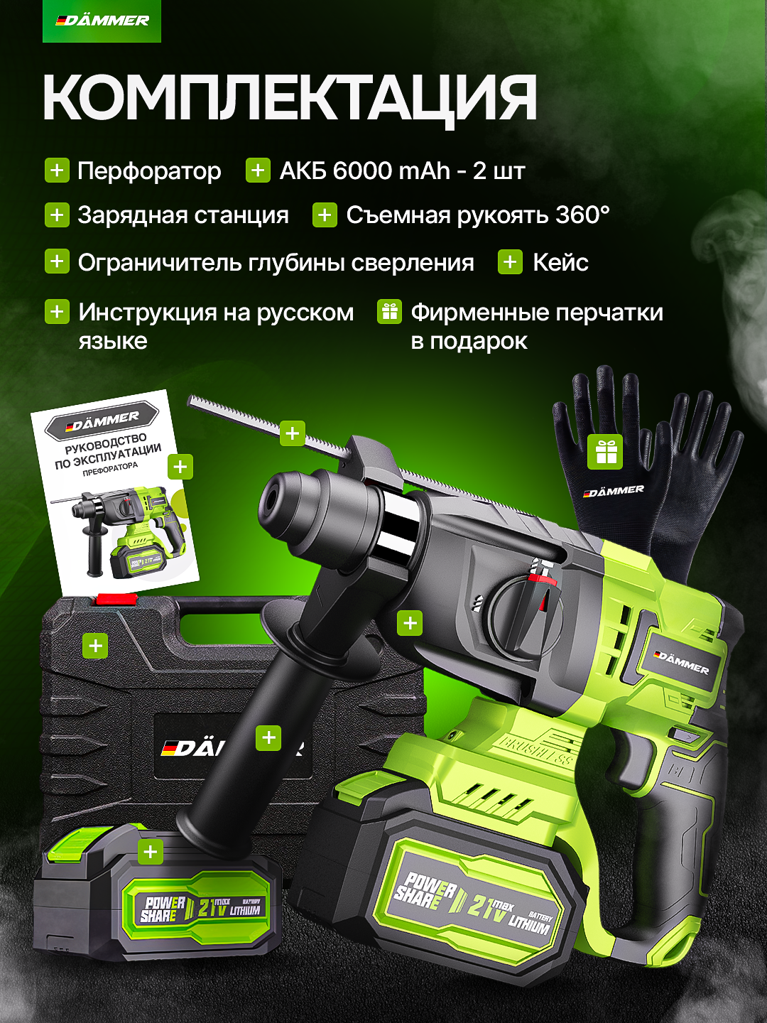 Перфоратор аккумуляторный бесщеточный DAMMER 21 V, 2.0 Дж, 2 аккумулятора 6 Ач интересное: