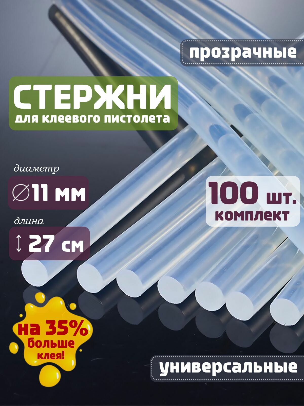 Клеевые стержни для клеевого пистолета 11 мм х 270 мм, термоклей, прозрачные 100 штук.