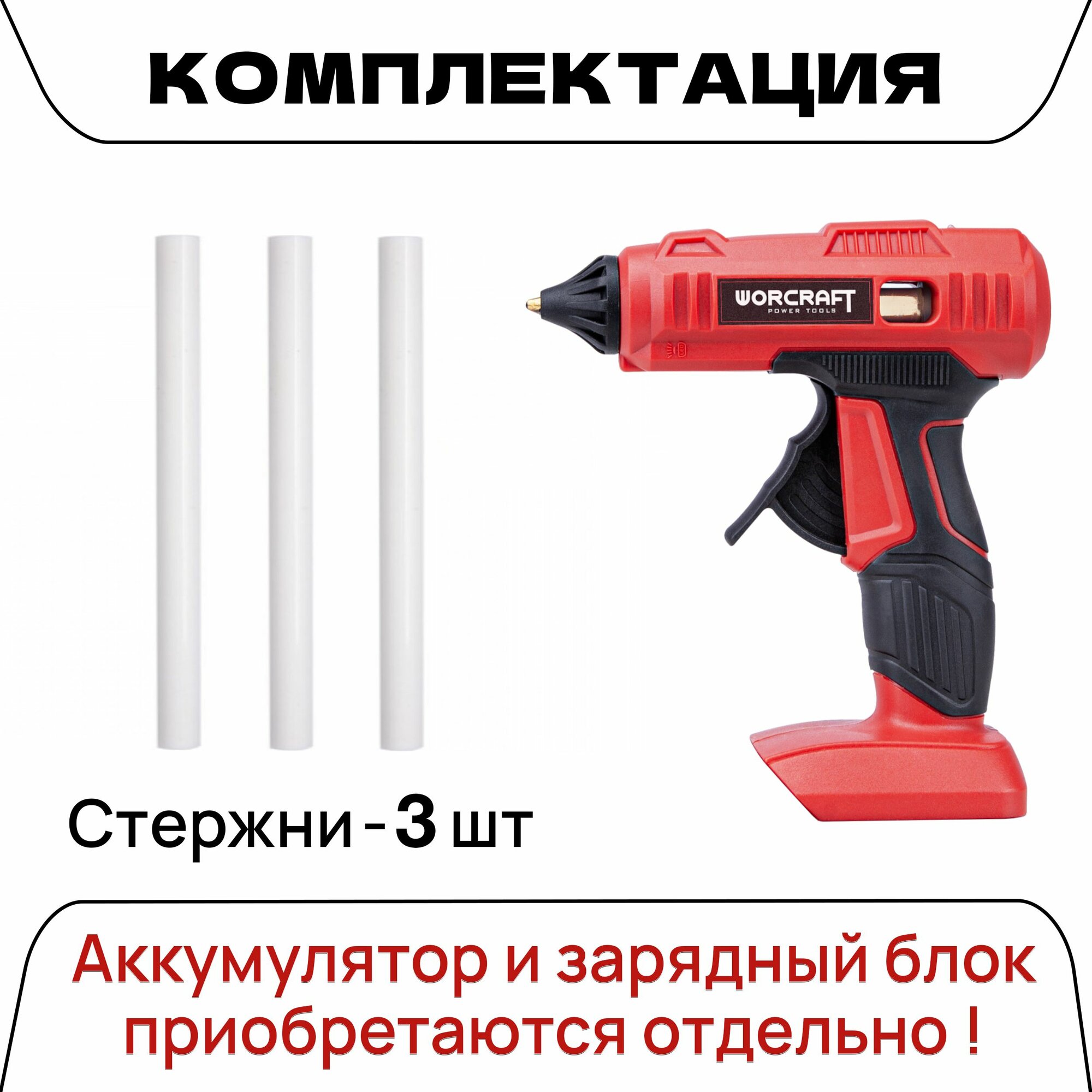 Купить WORCRAFT Клеевой пистолет аккумуляторный 190 градусов 15 гр/мин и 3 стержня, Без АКБ и СЗУ. Термопистолет клеевой.