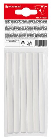 Клеевые стержни, диаметр 7 мм, длина 100 мм, прозрачные, комплект 6 шт, BRAUBERG, европодвес, 670291, 4 штуки интересное: