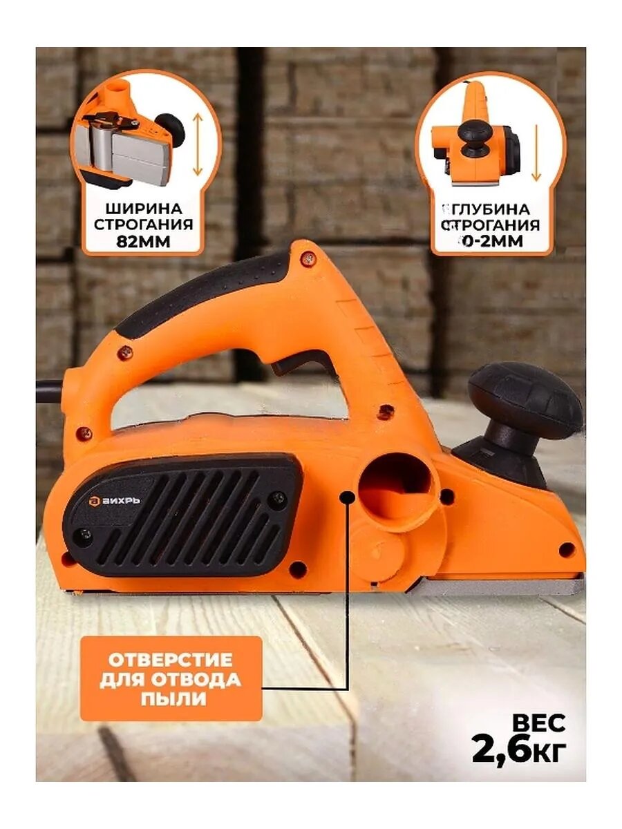 Рубанок электрический сетевой 800 Вт 16000 об/мин глубина 2 мм 82 мм вихрь 671127 (1)