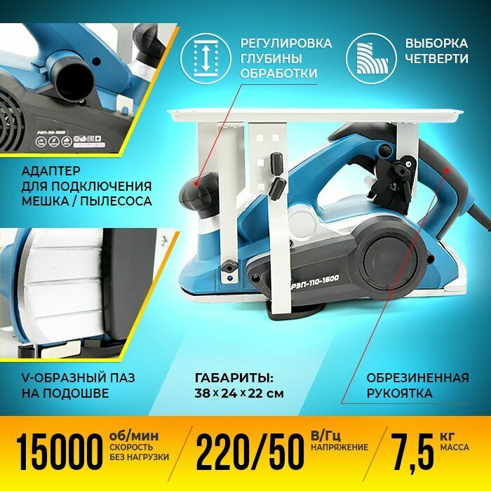 Купить Электрорубанок РЭП-110/1600, подключение к пылесосу, направляющая, плавный пуск