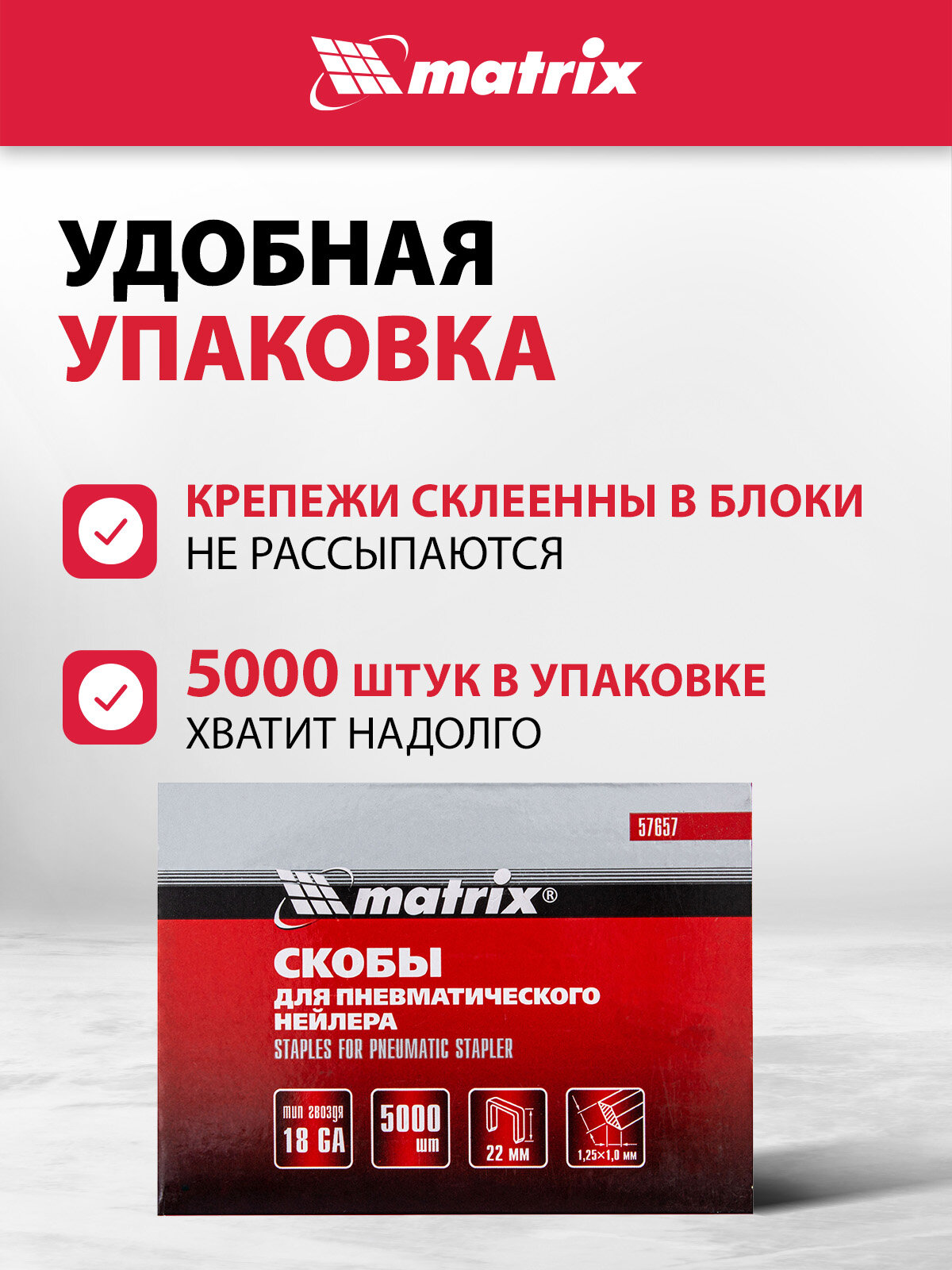 Скобы Matrix 18GA для пнев. степлера 1 ,25х1, 0мм длина 22 мм ширина 5, 7 мм, 5000 шт 57657 интересное: