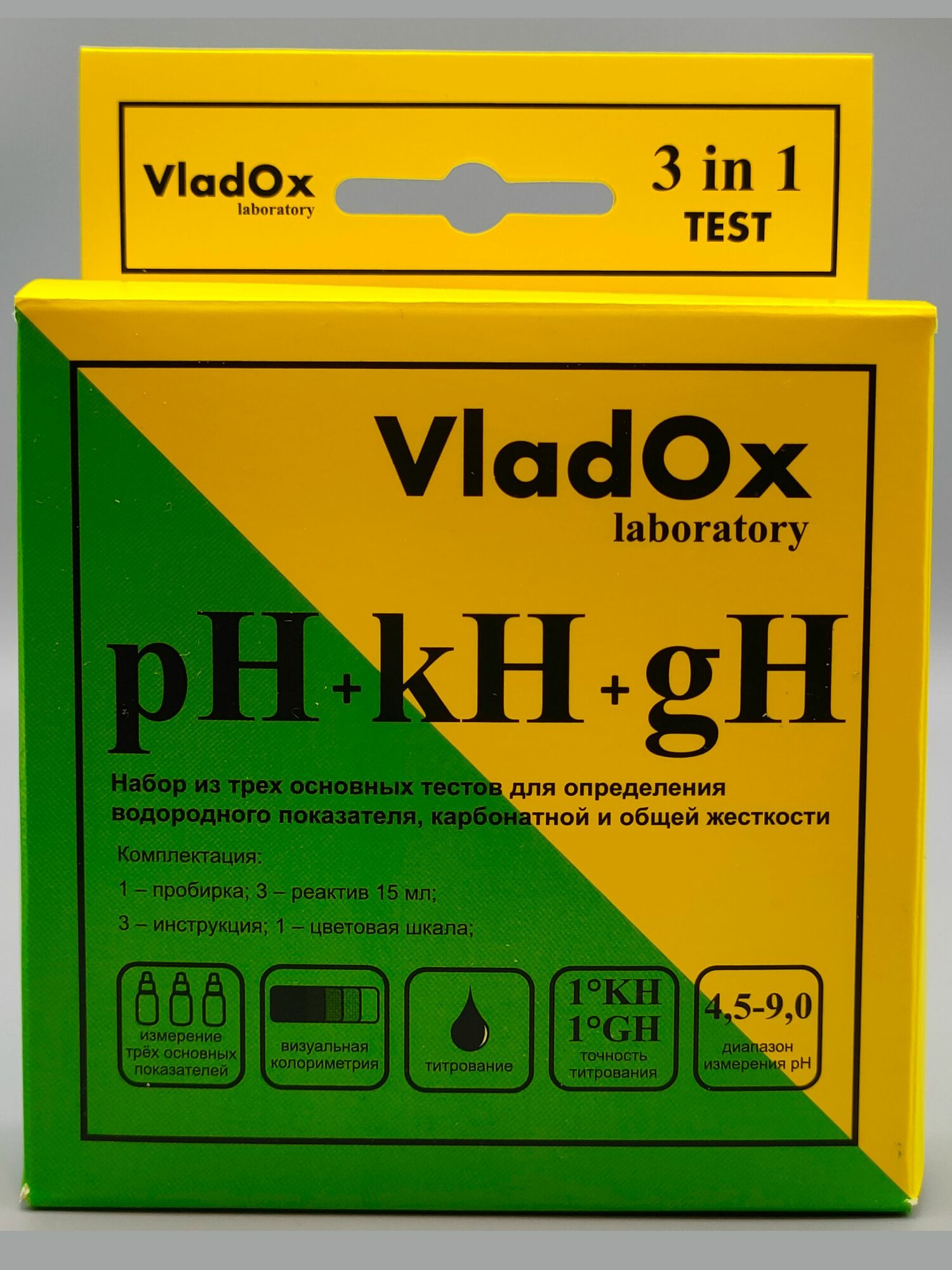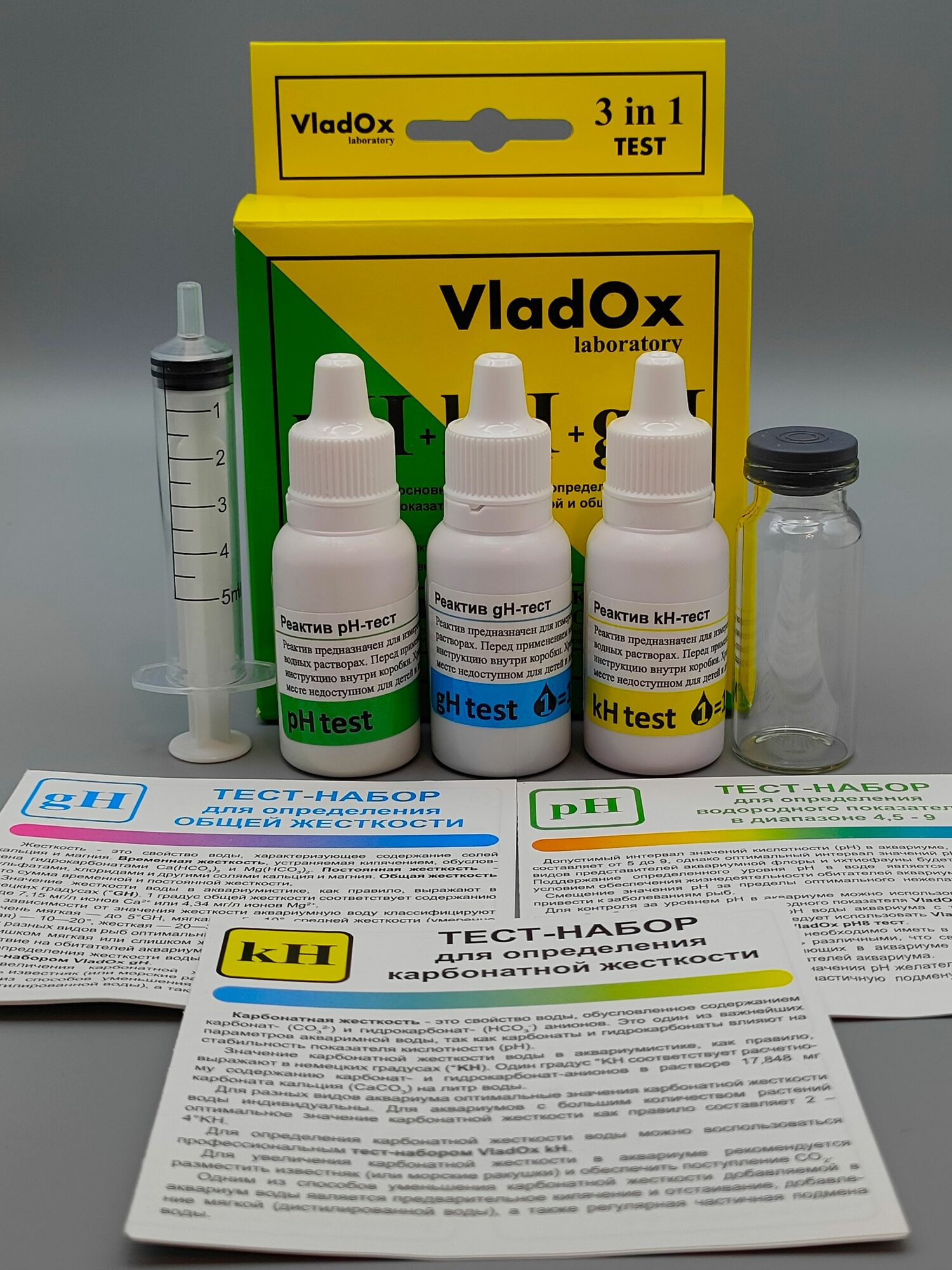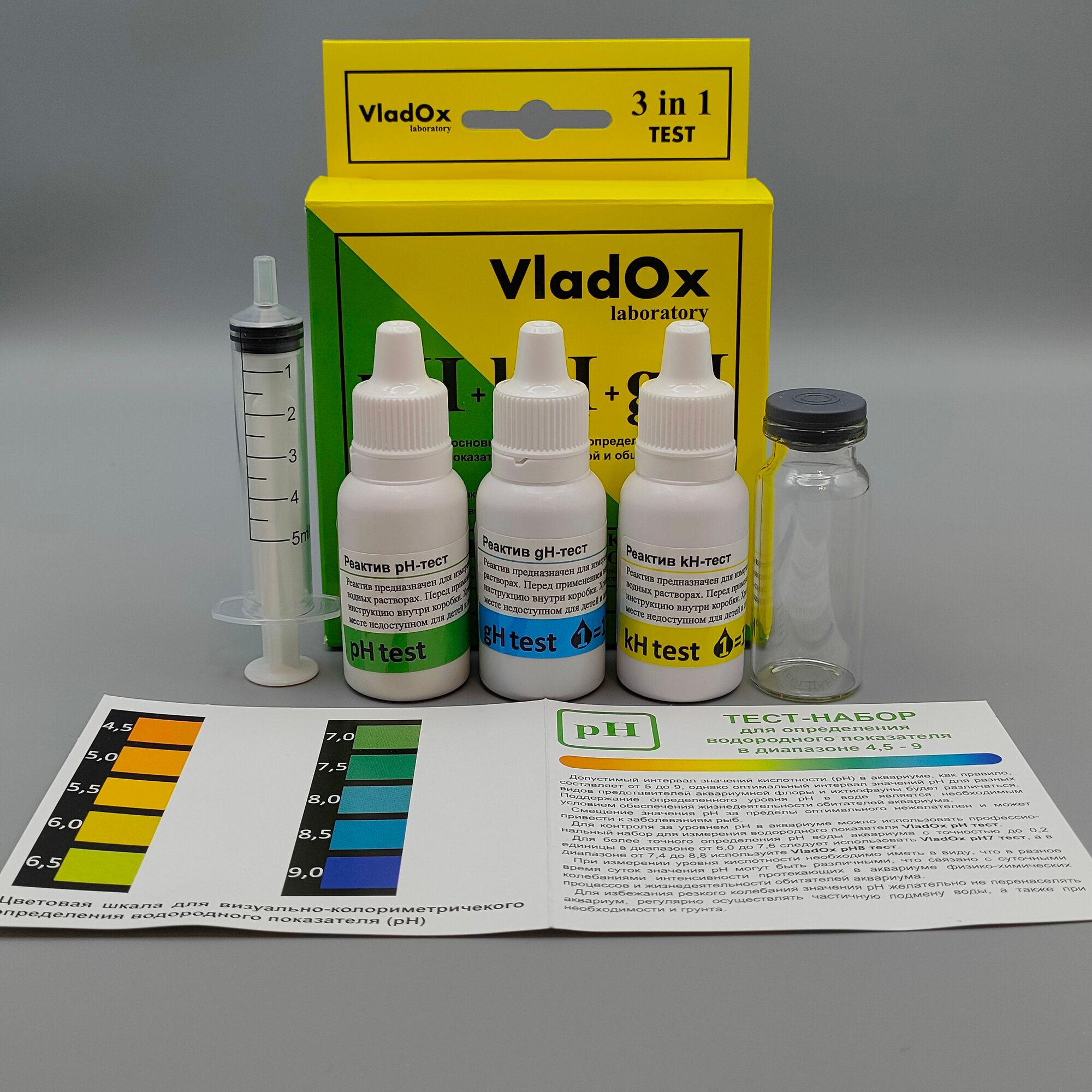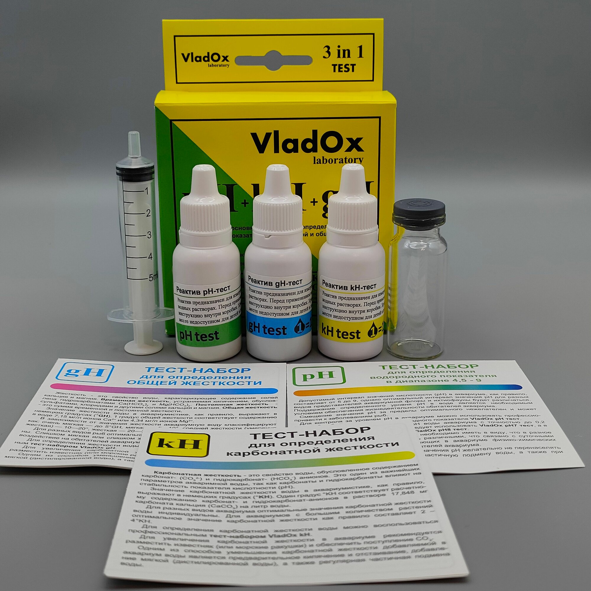 Набор тестов для измерений основных показателей воды из трёх тестов VladOx pH+gh+kh в пресном аквариуме интересное: