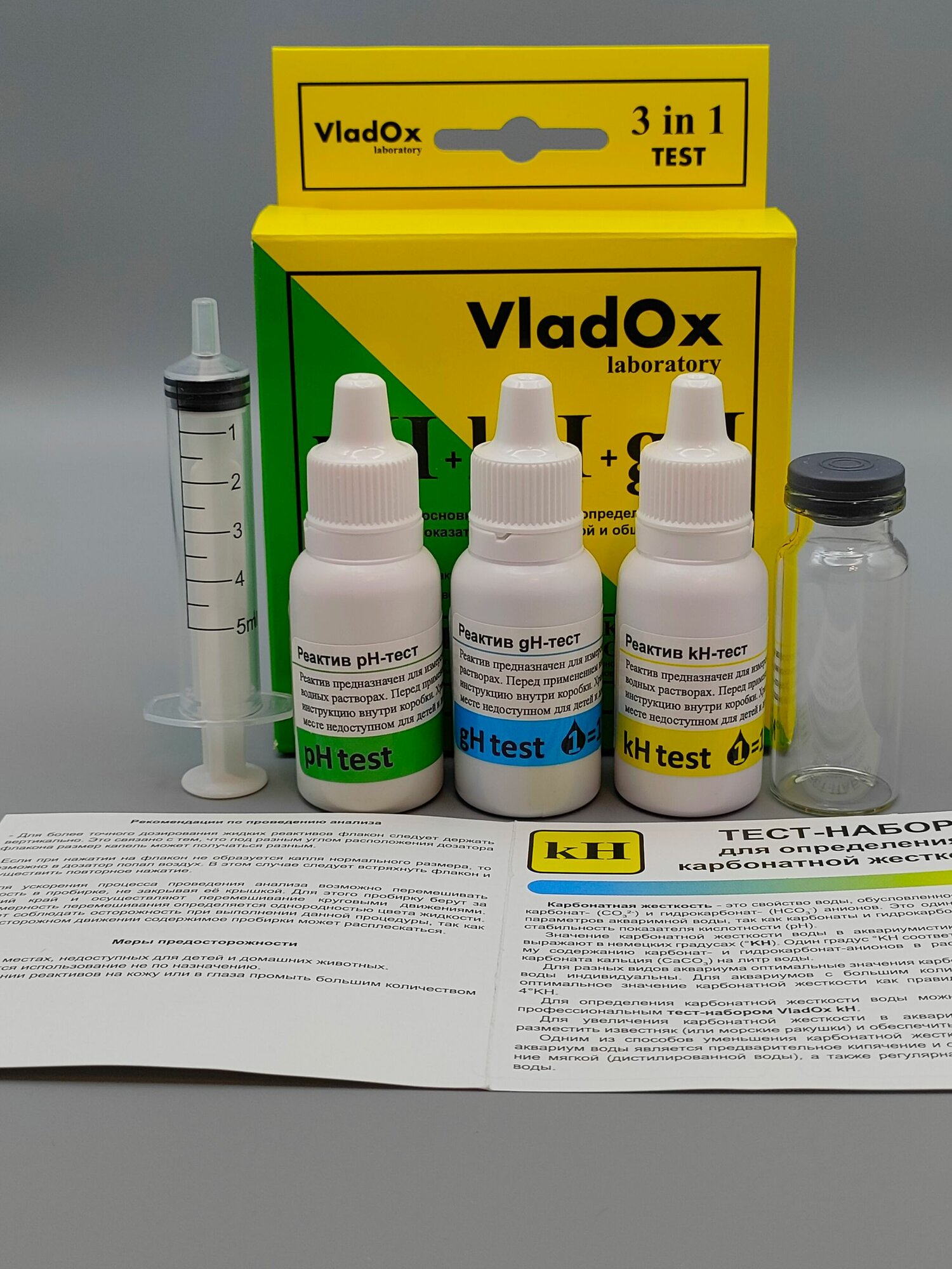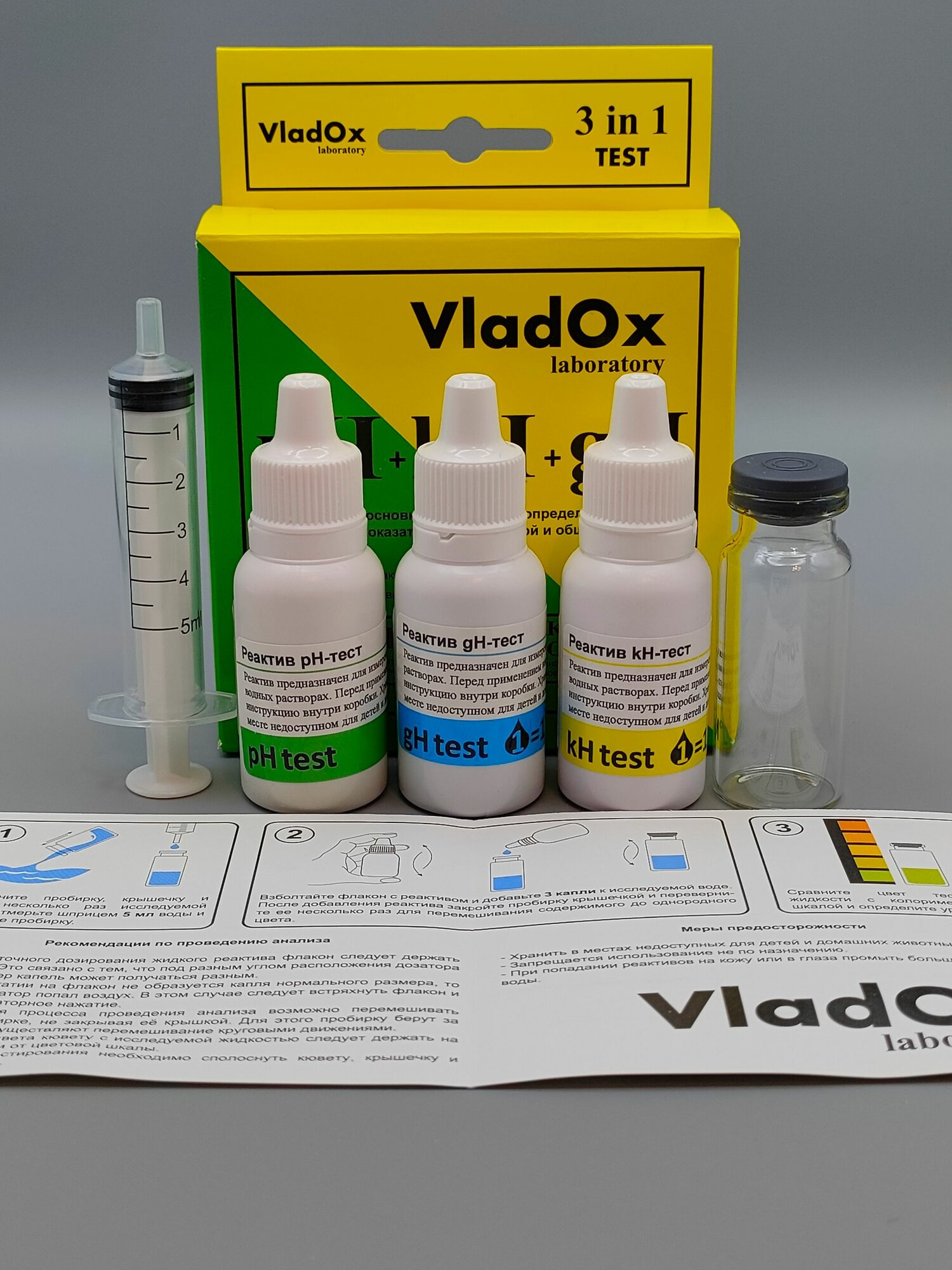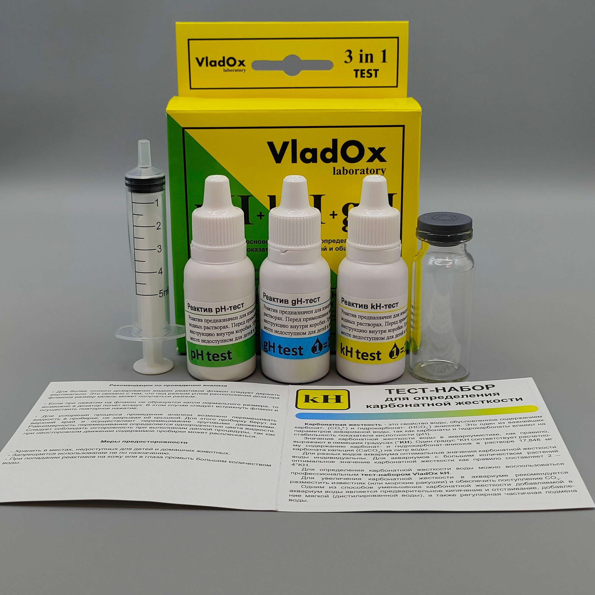 Набор тестов для измерений основных показателей воды из трёх тестов VladOx pH+gh+kh в пресном аквариуме интересное: