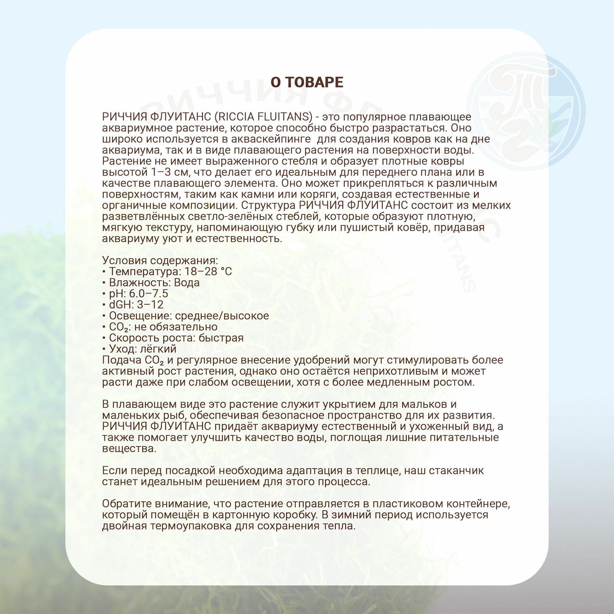 Ниже Вы можете прочитать отзывы на Риччия флуитанс (RICCIA FLUITANS) меристема живые растения in-vitro для аквариума, ознакомится с подробными характеристиками, посмотреть интересные обзоры и фотографии на Риччия флуитанс (RICCIA FLUITANS) меристема живые растения in-vitro для аквариума.