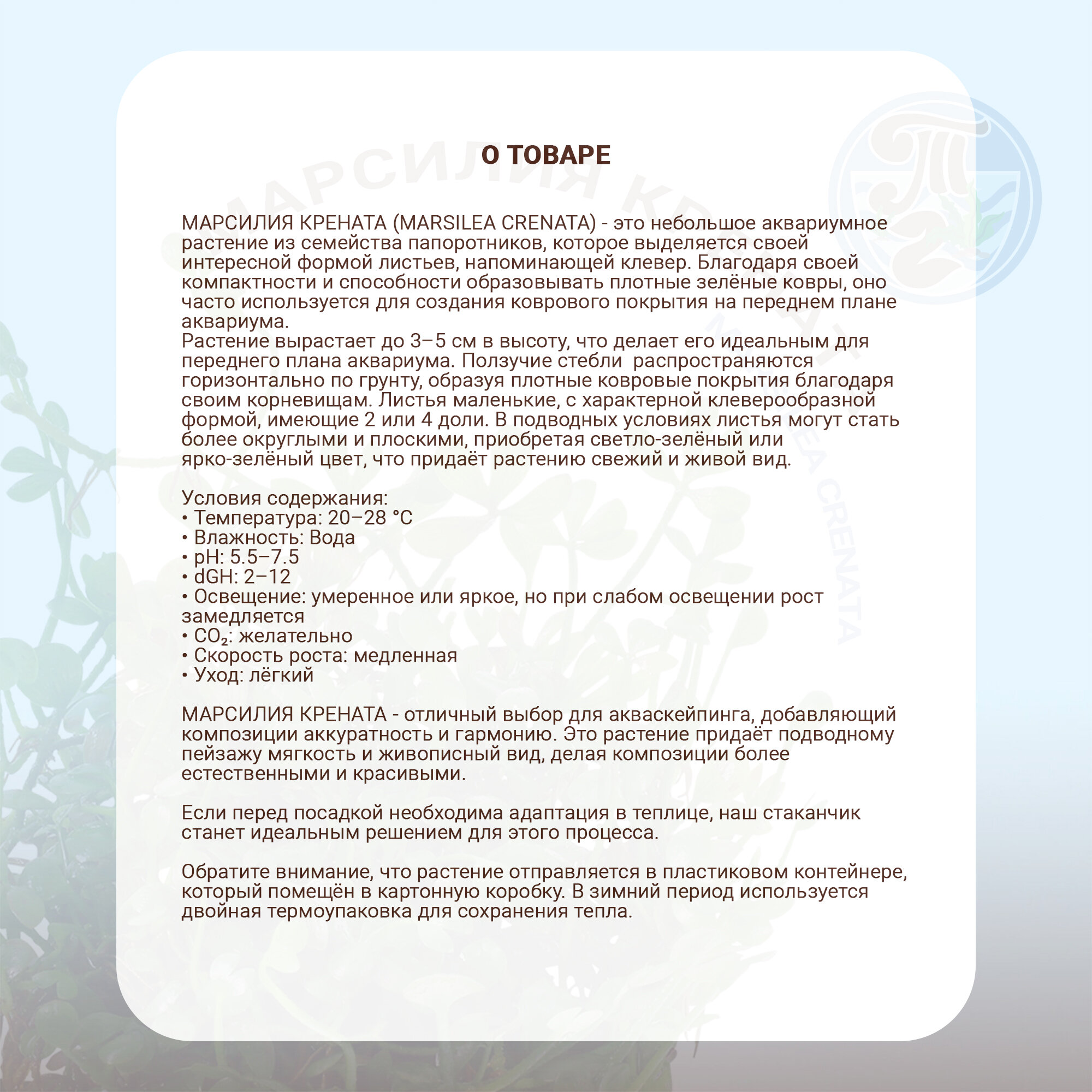 Ниже Вы можете прочитать отзывы на Марсилия крената (MARSILEA CRENATA) меристема живые растения in-vitro для аквариума, ознакомится с подробными характеристиками, посмотреть интересные обзоры и фотографии на Марсилия крената (MARSILEA CRENATA) меристема живые растения in-vitro для аквариума.