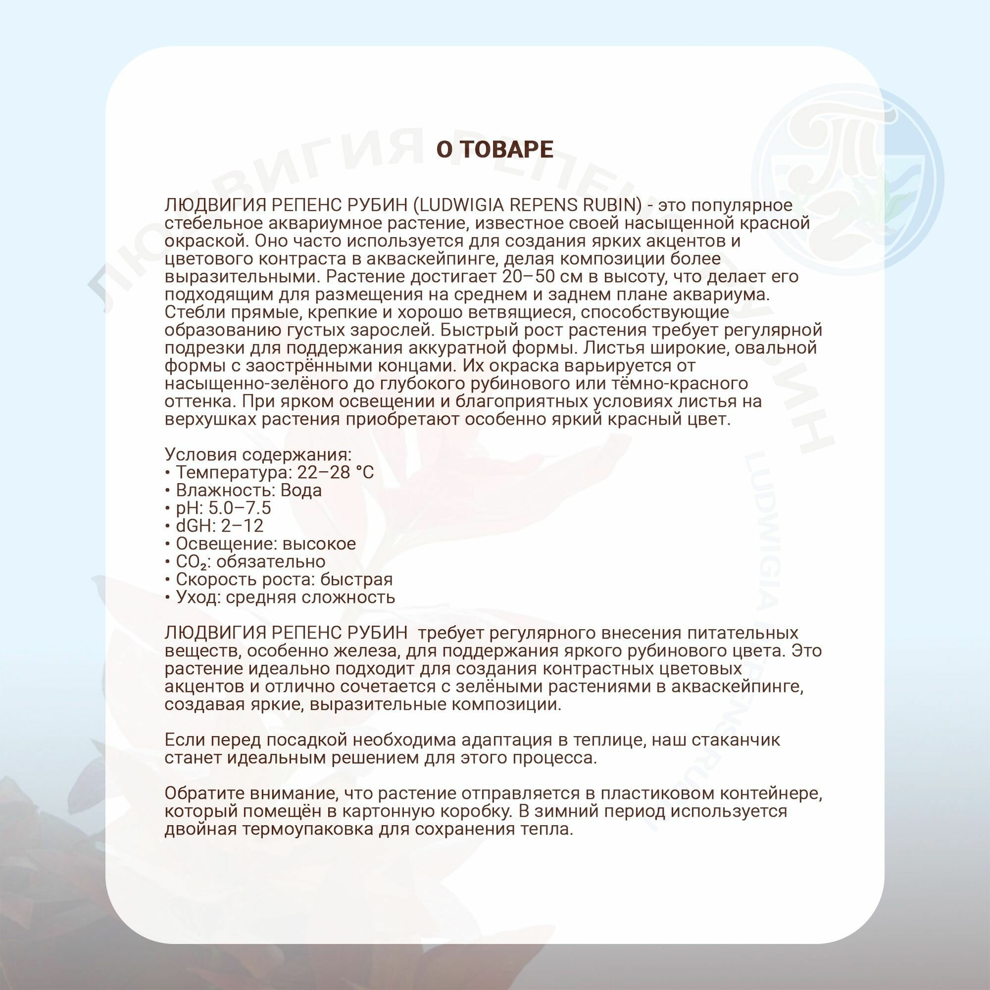 Ниже Вы можете прочитать отзывы на Людвигия репенс рубин (LUDWIGIA REPENS RUBIN) меристема живые растения in-vitro для аквариума, ознакомится с подробными характеристиками, посмотреть интересные обзоры и фотографии на Людвигия репенс рубин (LUDWIGIA REPENS RUBIN) меристема живые растения in-vitro для аквариума.