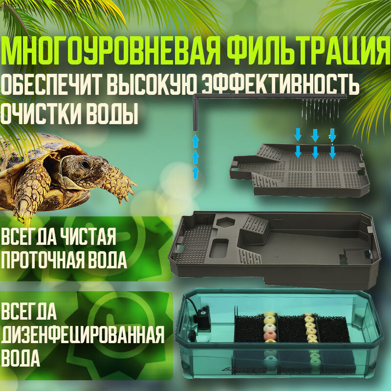 Аквариум для черепах с фильтром, фонтаном и подсветкой, зеленый,46х23х 20см интересное: