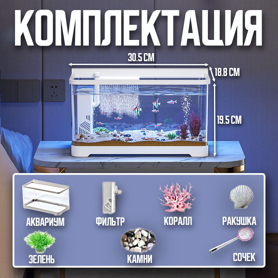 Аквариум с встроенной подсветкой и фильтром для рыб, белый,30.5х18.8х19.5см интересное:
