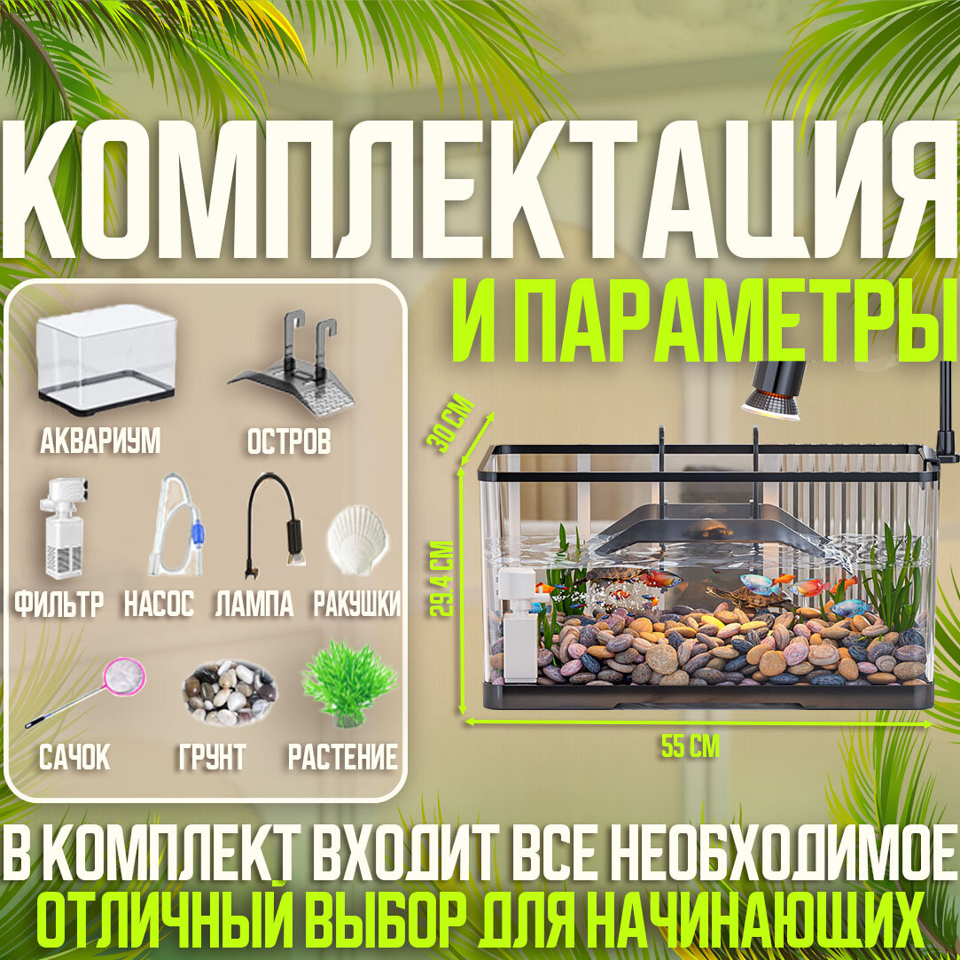 Купить Аквариум для рыб и черепах с встраиваемой лампой, фильтром и островом, черный,55x30x29.4CM