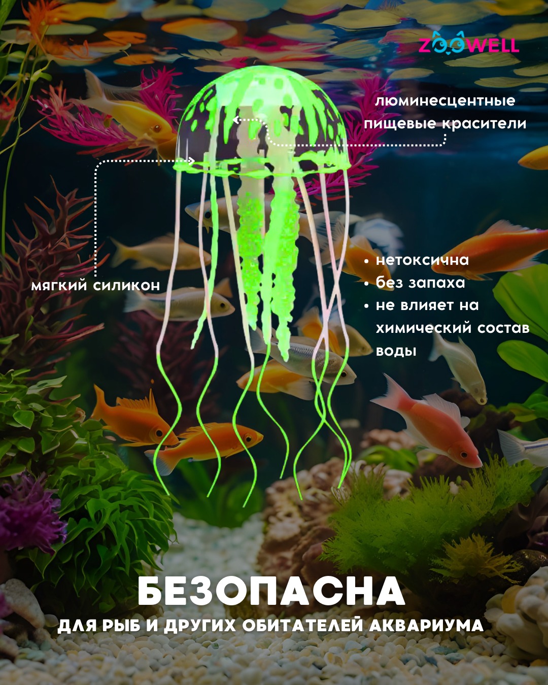 Купить Декорация для аквариума флуоресцентная ZooWell Neon Light (Медуза светящаяся), цвет зеленый
