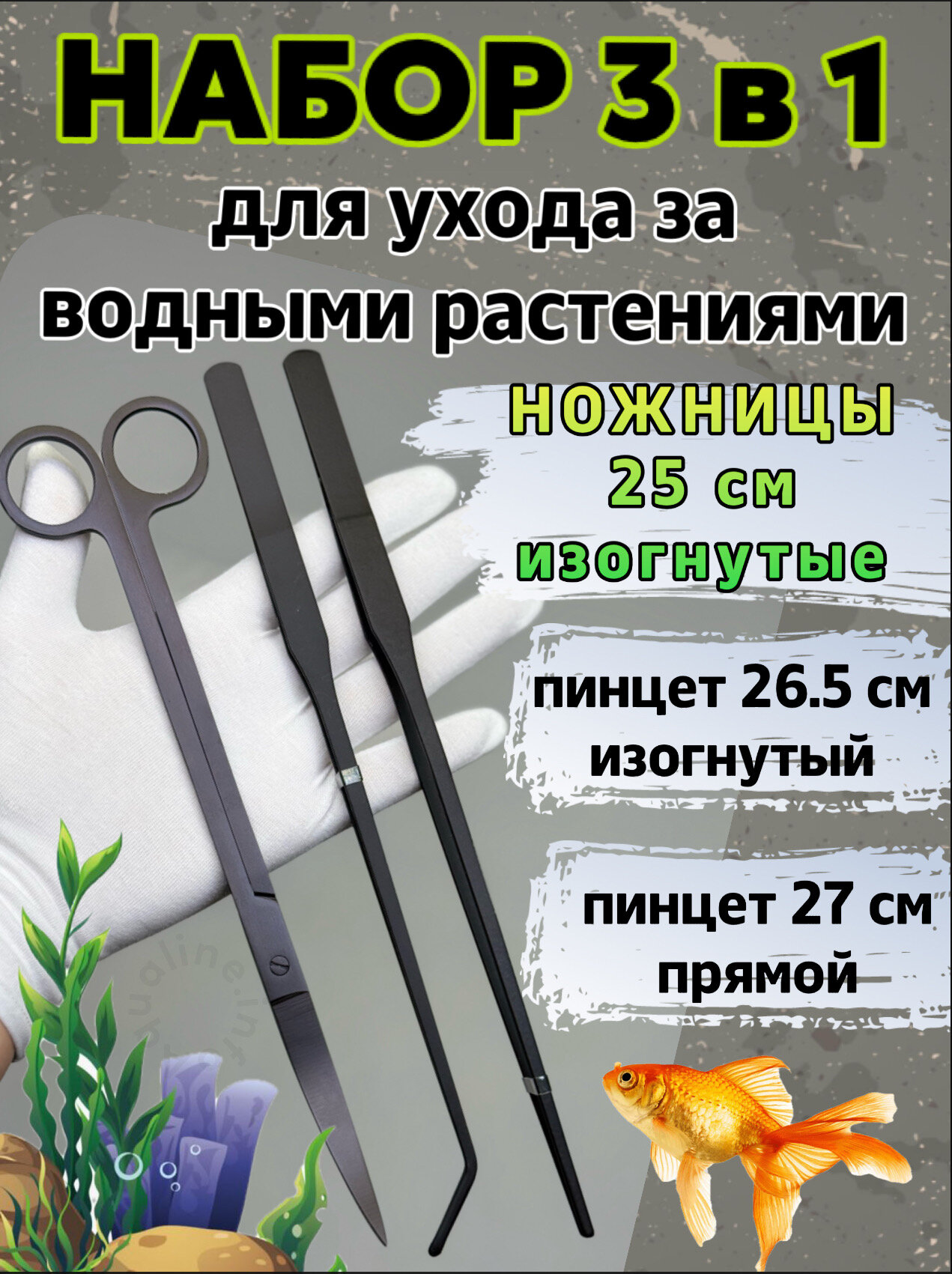 Набор для растений в аквариуме / ножницы изогнутые 25 см, пинцет прямой 27 см + изогнутый 26.5 см интересное: