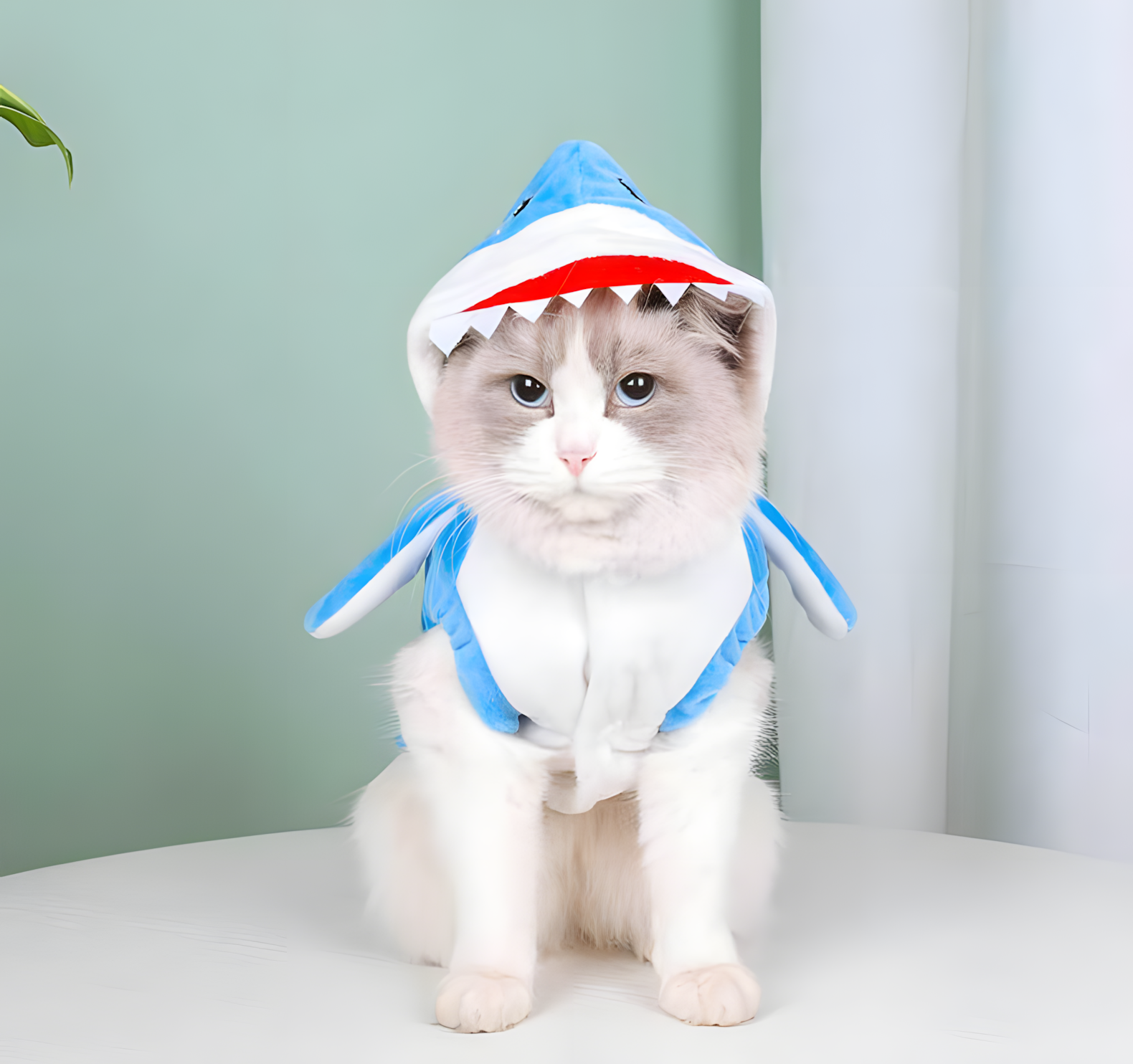 Костюм акулы для собак и кошек с капюшоном и плавником, M, голубой