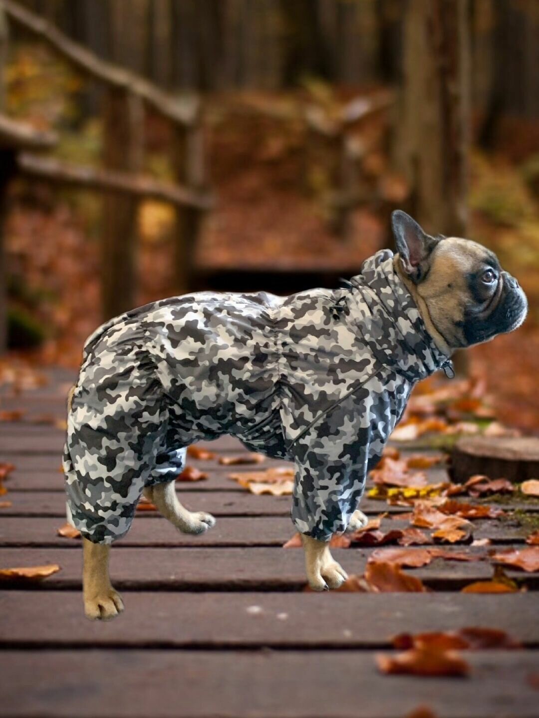 Комбинезон демисезонный с высоким воротом/снуд для собак: французских бульдогов, мопсов, камуфяж, ФР-2
