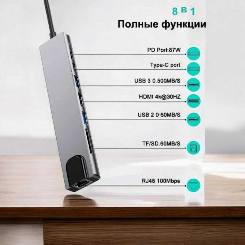 USB ХАБ 8 в 1 - концентратор AOCV с Type-c HDMI и RJ-45, 2хUSB3 и 2хType-c, SD, TF, PD интересное: