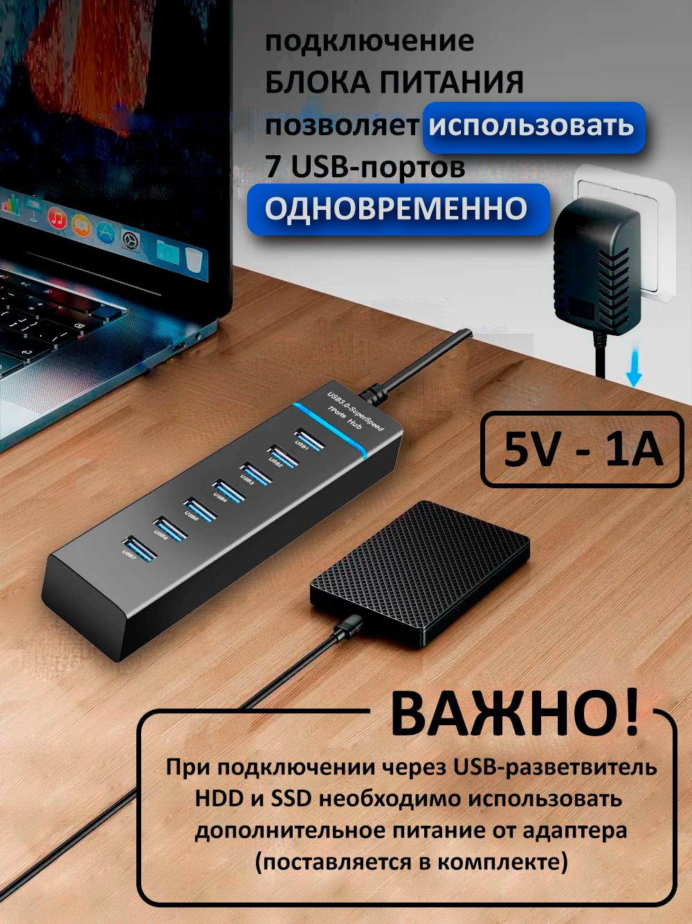USB-разветвитель 3.0 на 7 портов ZIRE, модель 307, кабель 120 см, блок питания в комплекте интересное: