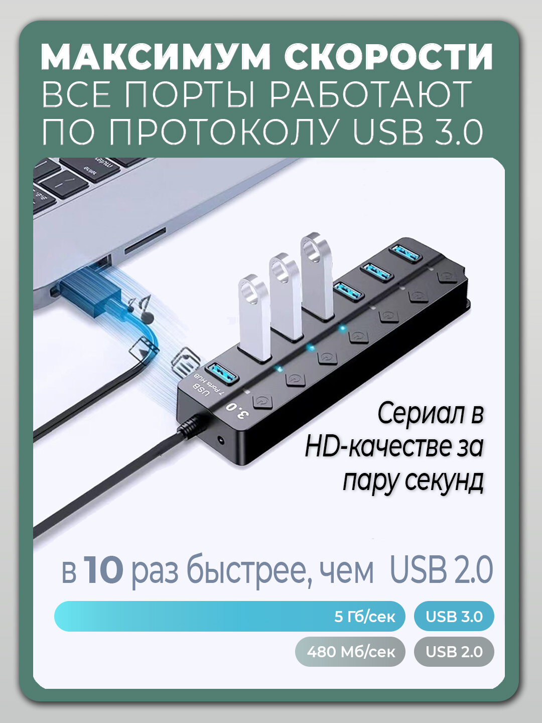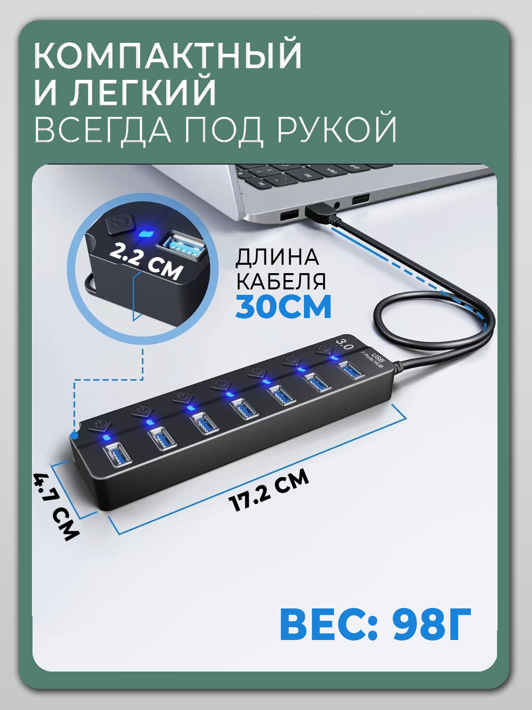 USB HUB 3.0 Разветвитель на 7 портов USB 3.0 с выключателями и подсветкой активный интересное:
