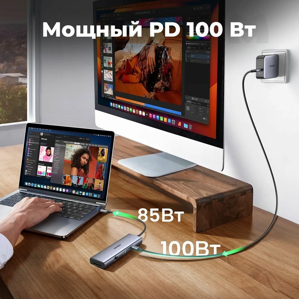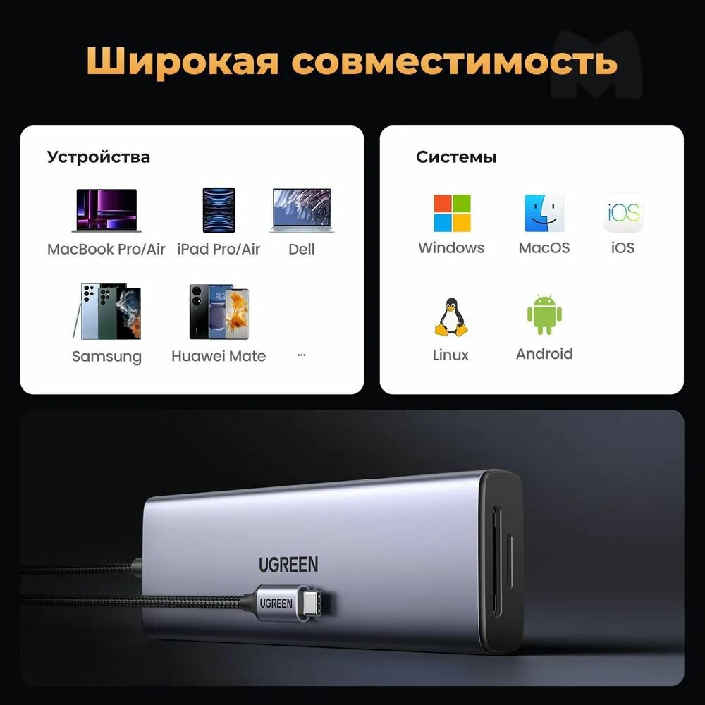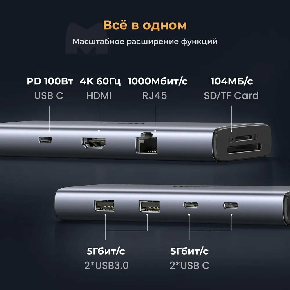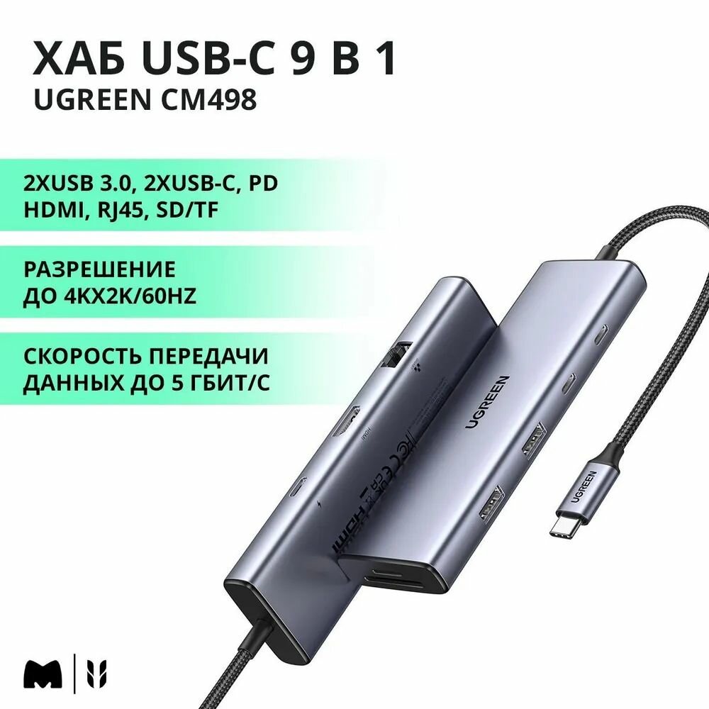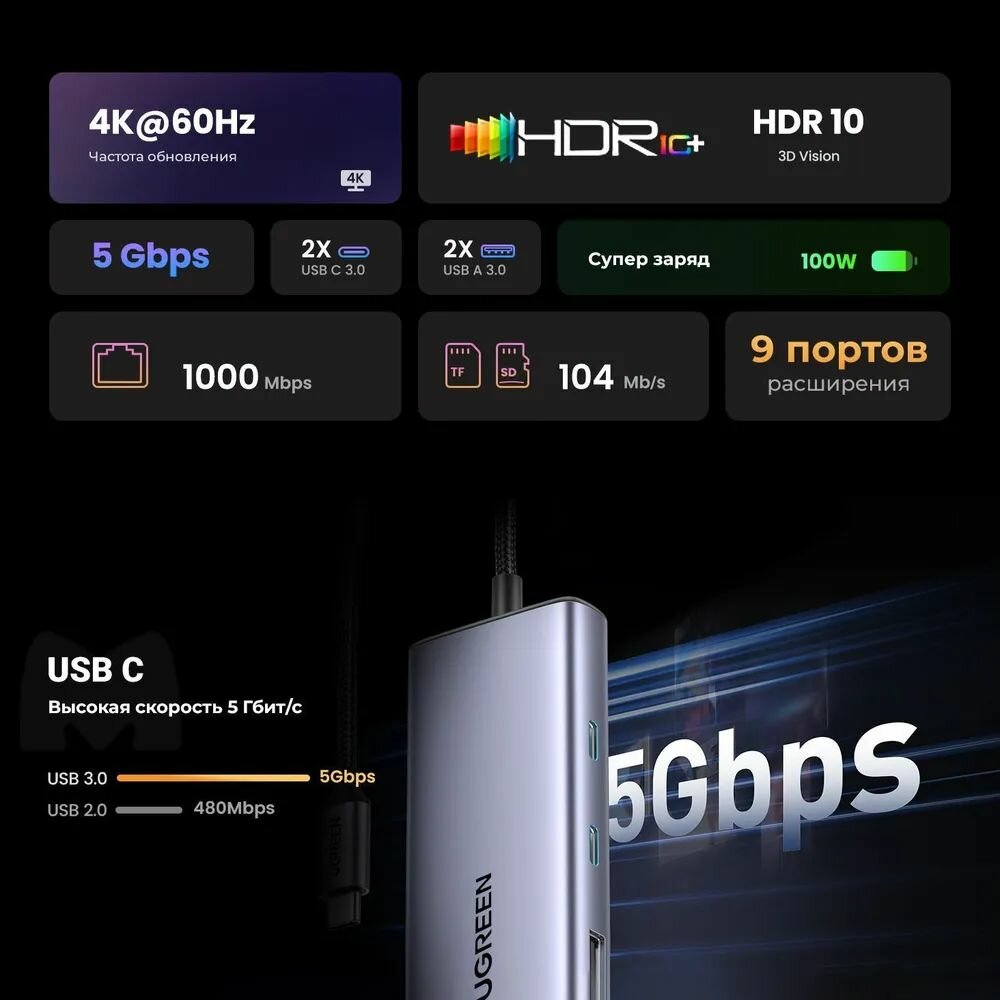 Конвертер UGREEN CM498 (15375) 9-in-1 USB-C to 2xUSB3.0, 2xUSB Type C, HDMI, RJ45, SD&TF, PD port Converter. Цвет: серый интересное: