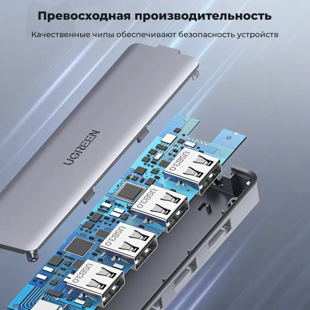 Конвертер UGREEN CM498 (15375) 9-in-1 USB-C to 2xUSB3.0, 2xUSB Type C, HDMI, RJ45, SD&TF, PD port Converter. Цвет: серый