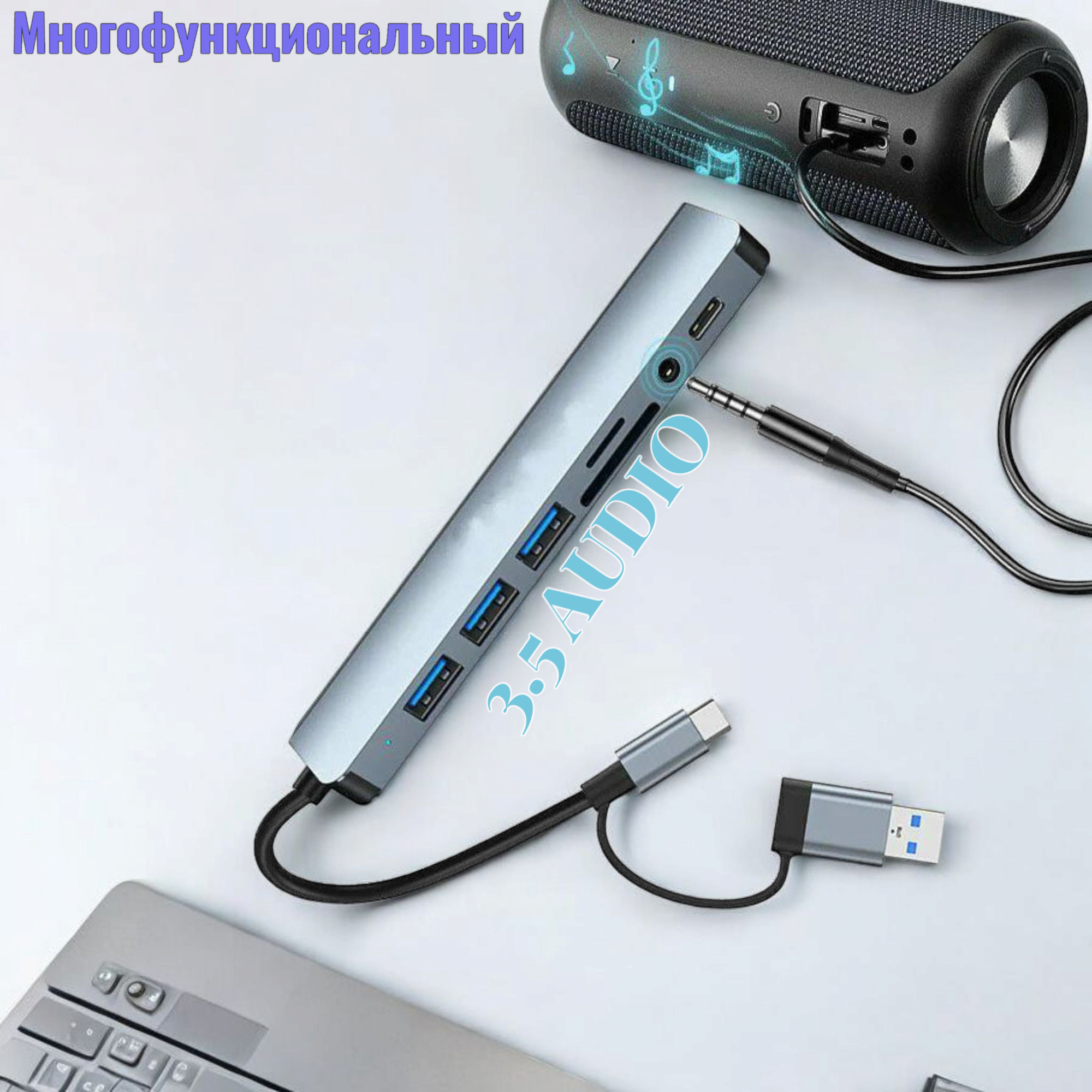 Купить Переходник-адаптер 8 в 1 с 4 портами, USB портом, USB C Устройство считывания карт TF/SD, Аудиовыход
