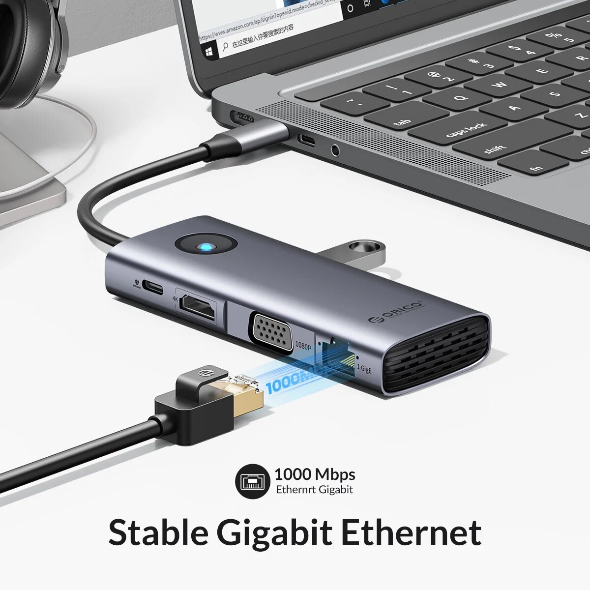 Кабель-переходник Orico PW11-10P Type-C на HDMI/USB3.0x3/USB-C/MicroSD/TF/AUX/VGA/RJ45 серый интересное: