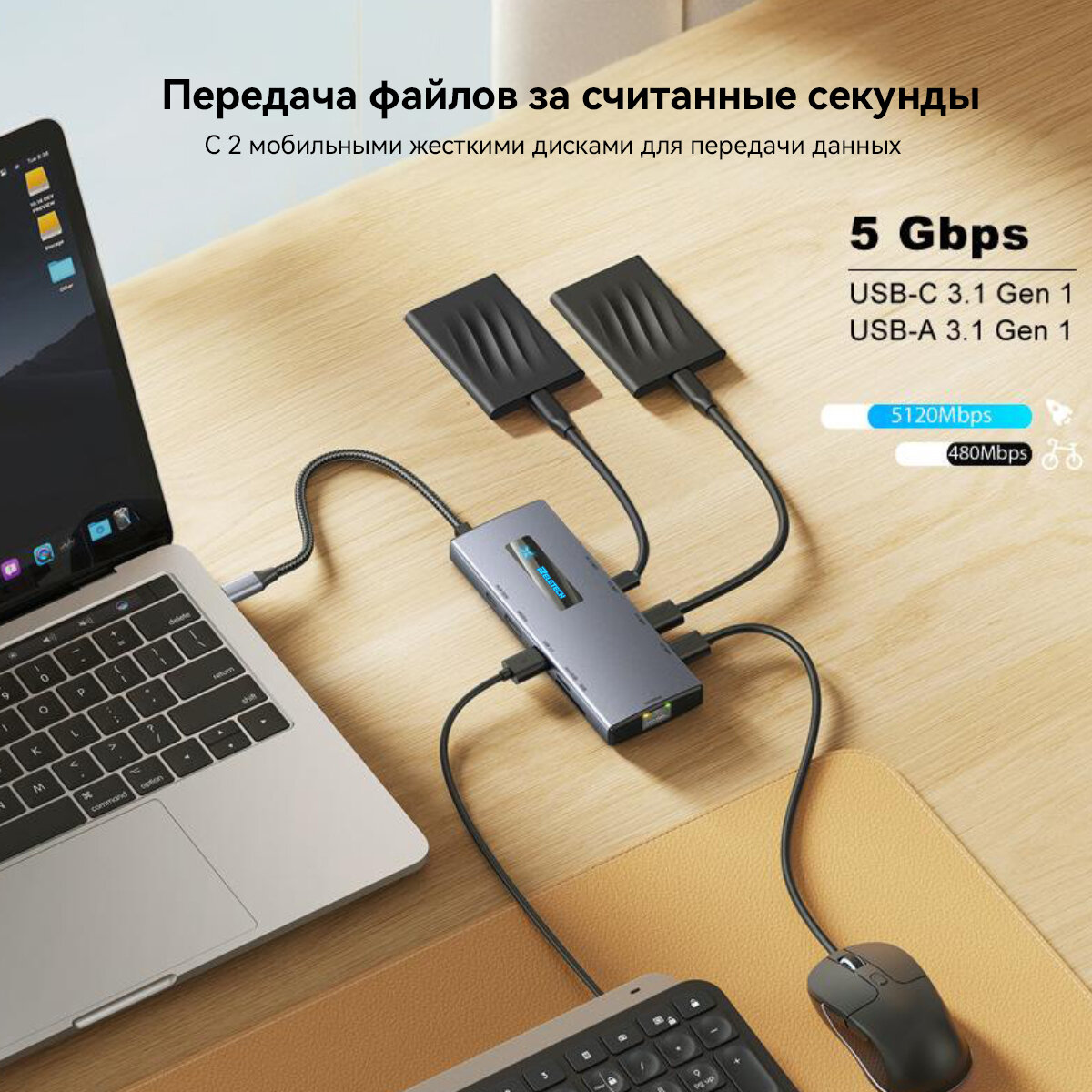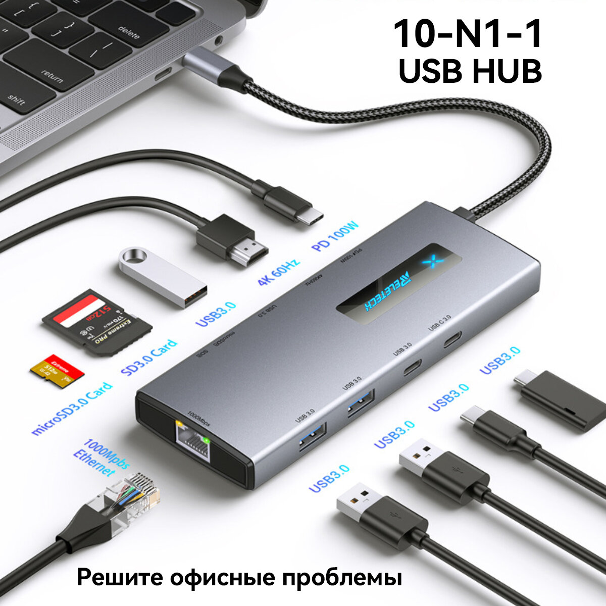 Концентратор USB - C концентратор 10 в 1 / адаптер USB 3.0x3, USB - C 3.0x2, HDMI 4K, 1000 Mpbs Ethernet, microSD3.0 Card, SD3.0 Card, PD Зарядка до 100W для MacBook Pro/Air интересное: