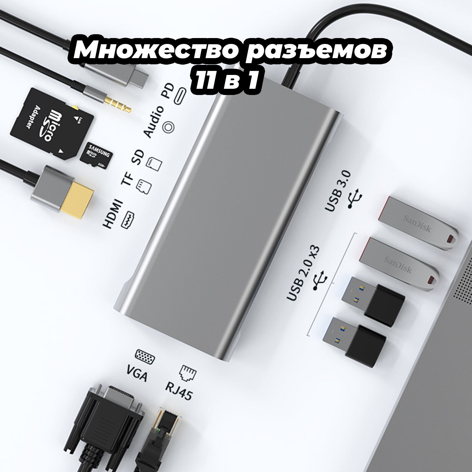 СохранитьПереходник для ноутбука и macbook 11 в 1 Hdmi, Vga, SD, MicroSD, Type-C, USB, lan internet rg45, aux интересное: