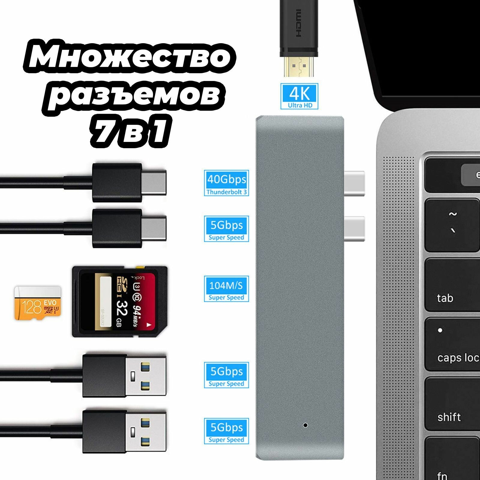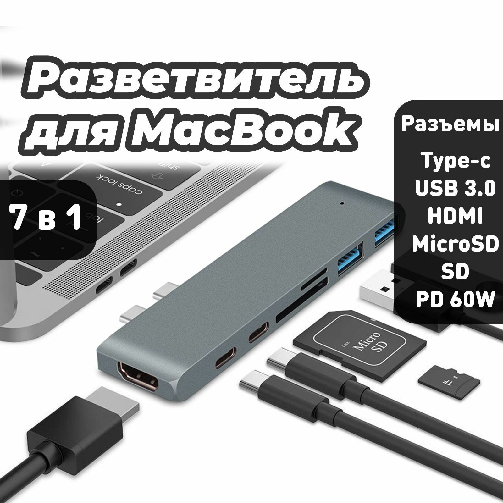 Купить USB разветвитель для Macbook 7 в 1 Hdmi 4K, Usb 3.0, SD, TF, MicroSD, Thunderbolt 4, PD