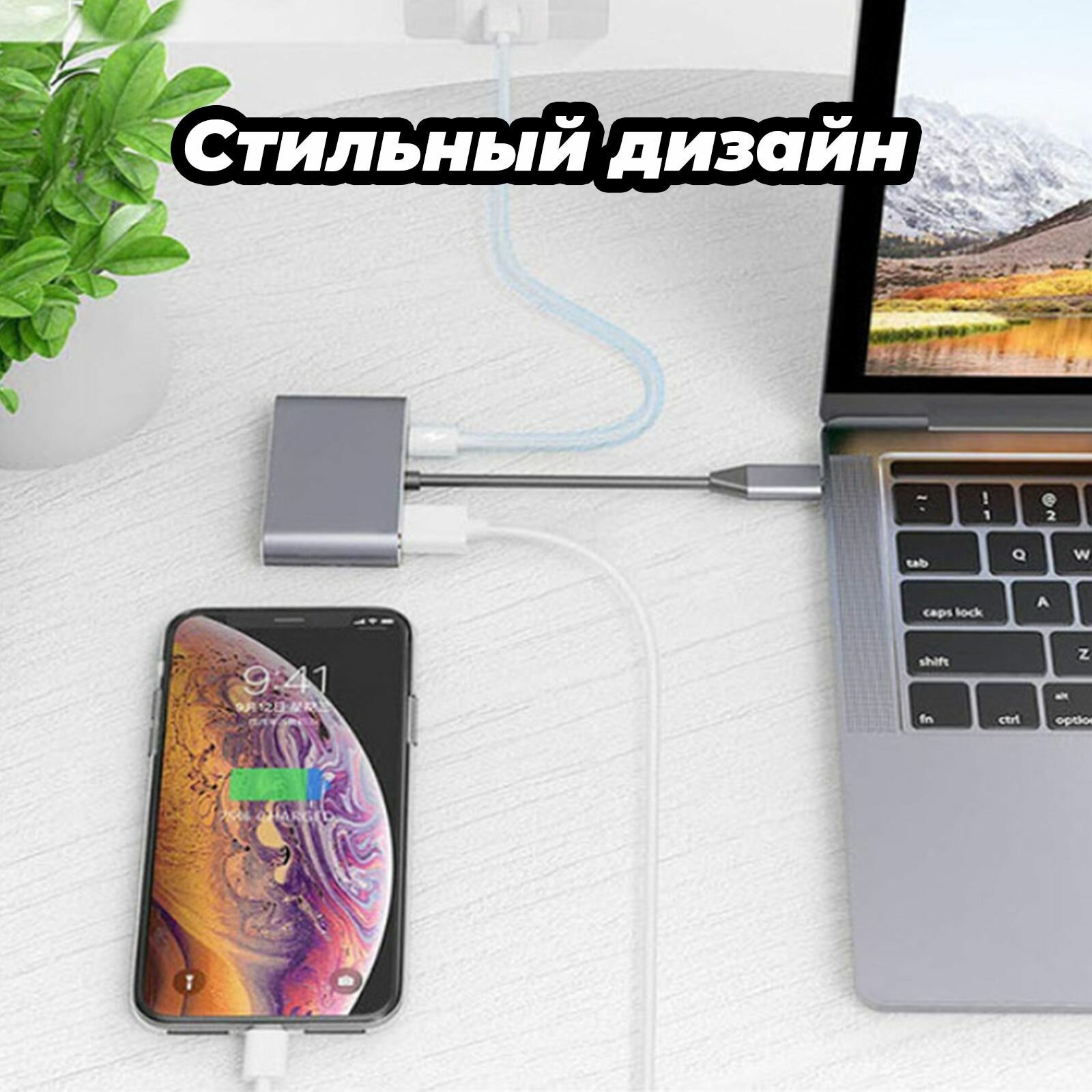 Переходник для Macbook и ноутбука usb Hub 4 в 1 длина 12 см, черный адаптер