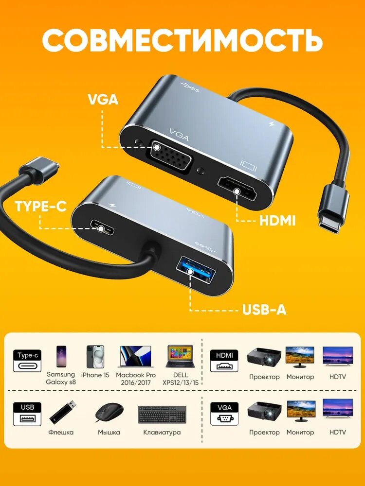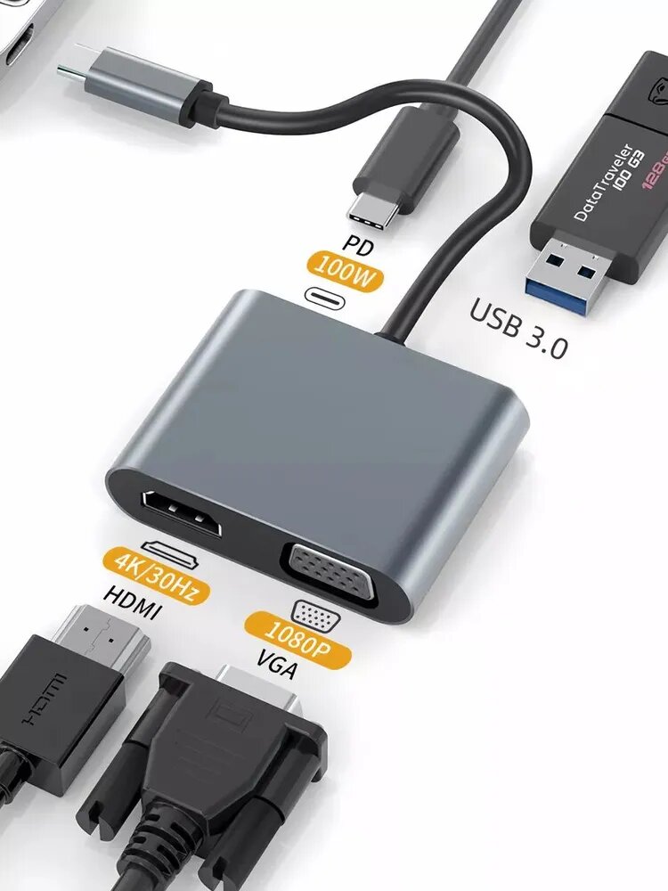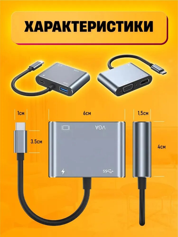 Type-C Hub/Переходник адаптер для ноутбука 4в1 HDMI VGA USB Type-C/Видеоадаптер/Переходник HDMI/Адаптер для компьютера интересное: