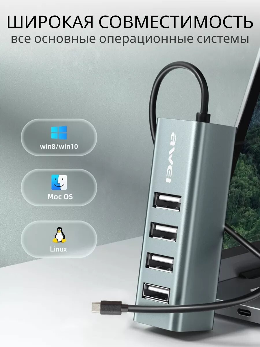 USB-хаб AWEI CL-122T, 4 порта Type-C/USB, алюминиевый корпус, серый интересное: