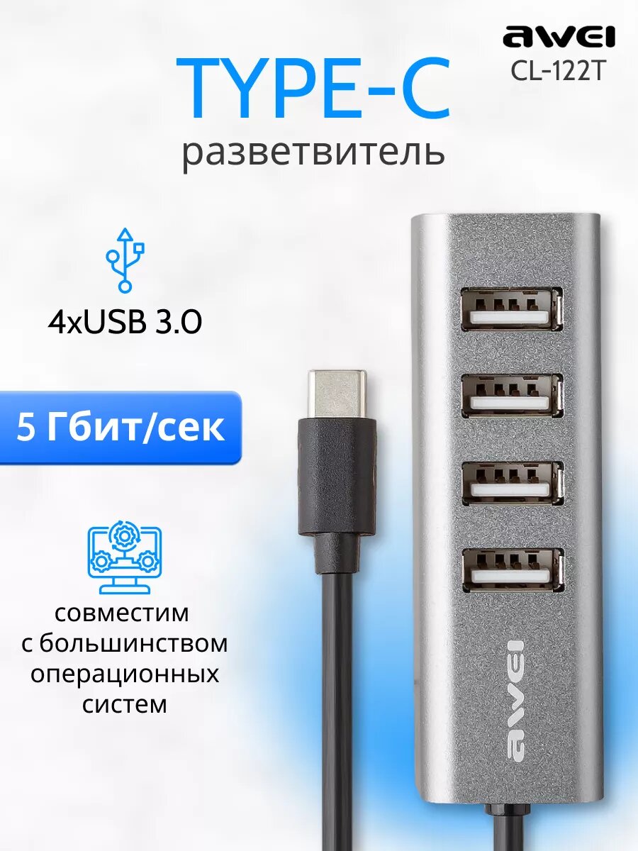 Купить USB-хаб AWEI CL-122T, 4 порта Type-C/USB, алюминиевый корпус, серый
