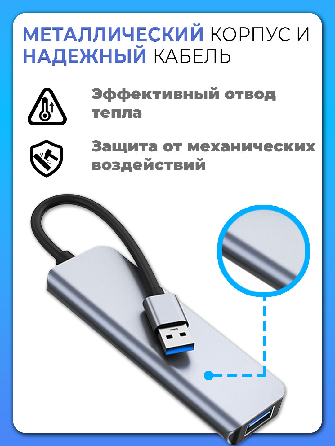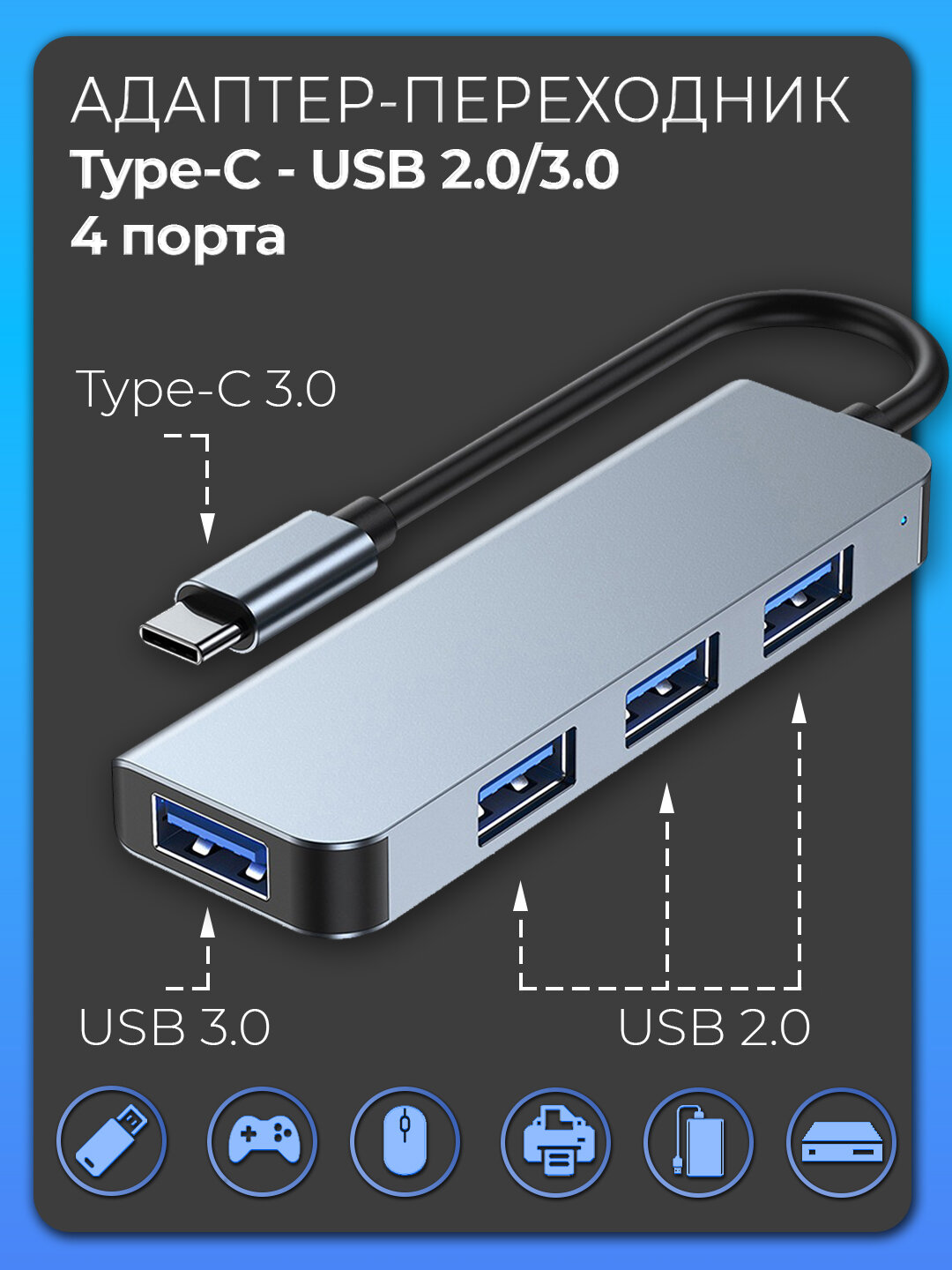 Переходник OTG 4в1, USB Type-C - USB 3.0/USB 2.0*3, 95x30x10 мм, серый металлик интересное: