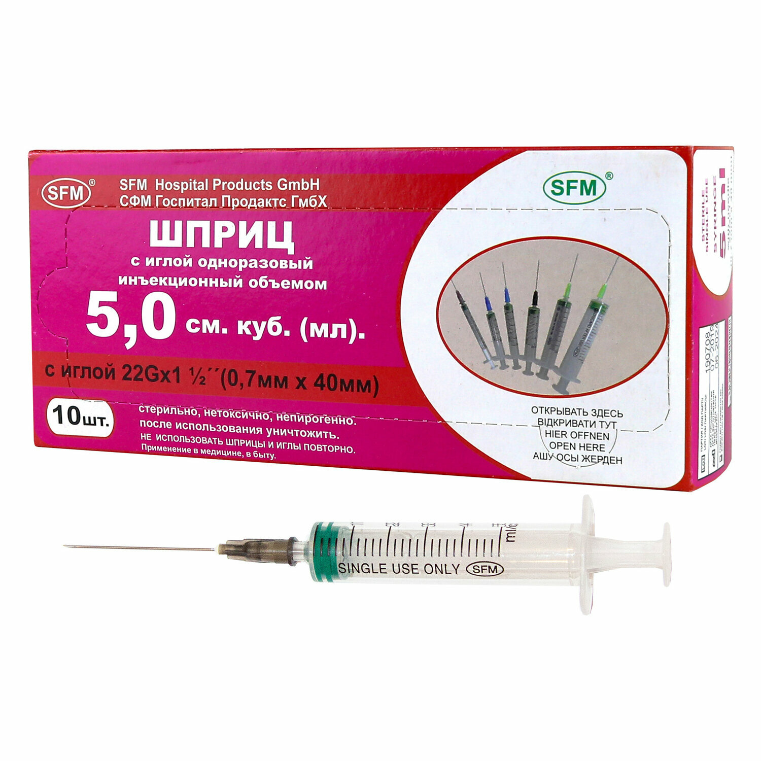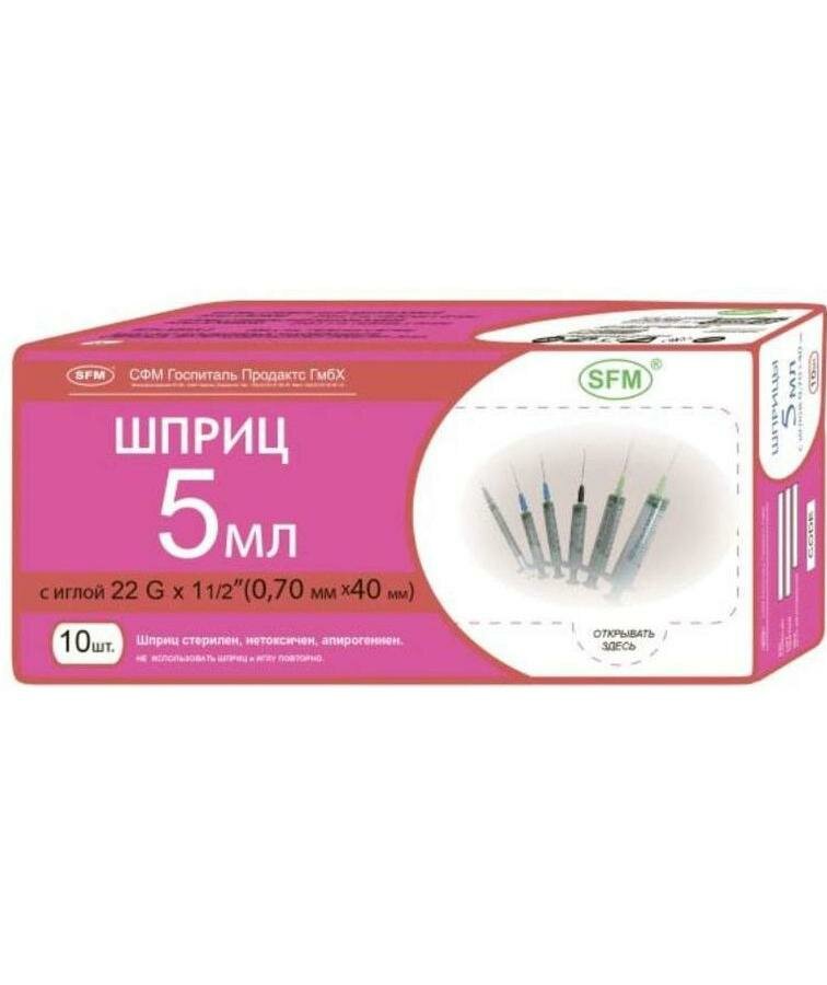 Шприцы СФМ Госпитал Продактс Шприц однораз 5мл 3-х комп игла (0.7х40мм) №10 SFM