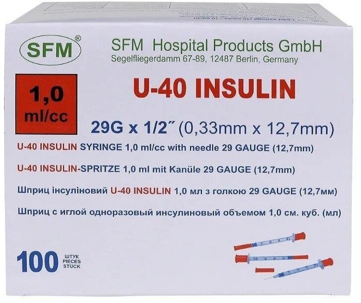 Шприц одноразовый инсулиновый U-40 SFM с иглой (1 мл, 29G (0,33х12,7 мм), 100 шт, Интегрированная)