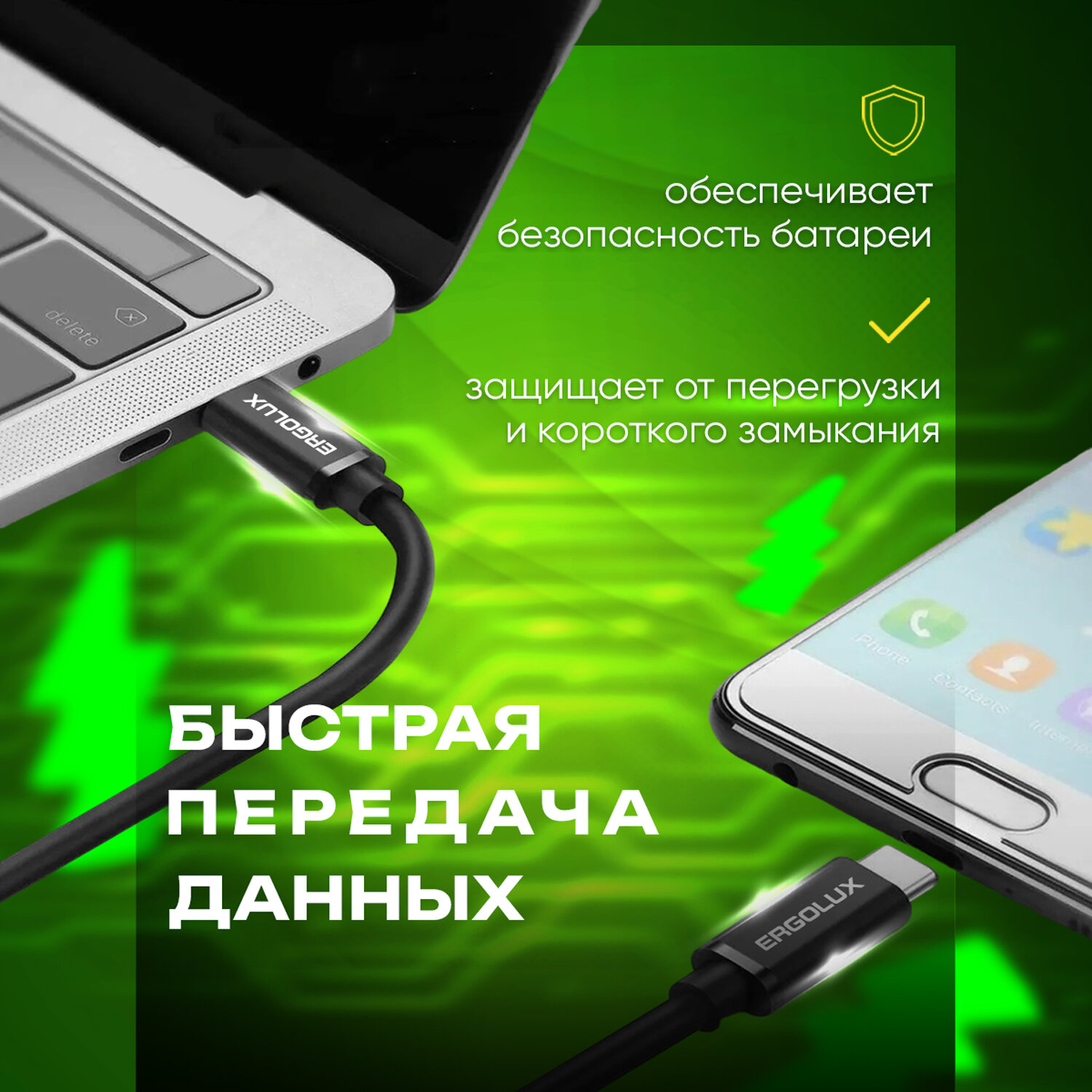 Кабель зарядки USB-Type C ERGOLUX 2A, 1 метр, черный, передача данных