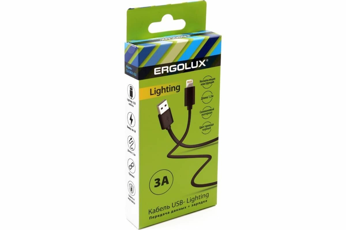 Купить Кабель usb-lightning Ergolux Elx-cdc03-c02 3а, 1,2м, черный, зарядка+передача данных, коробка 15096