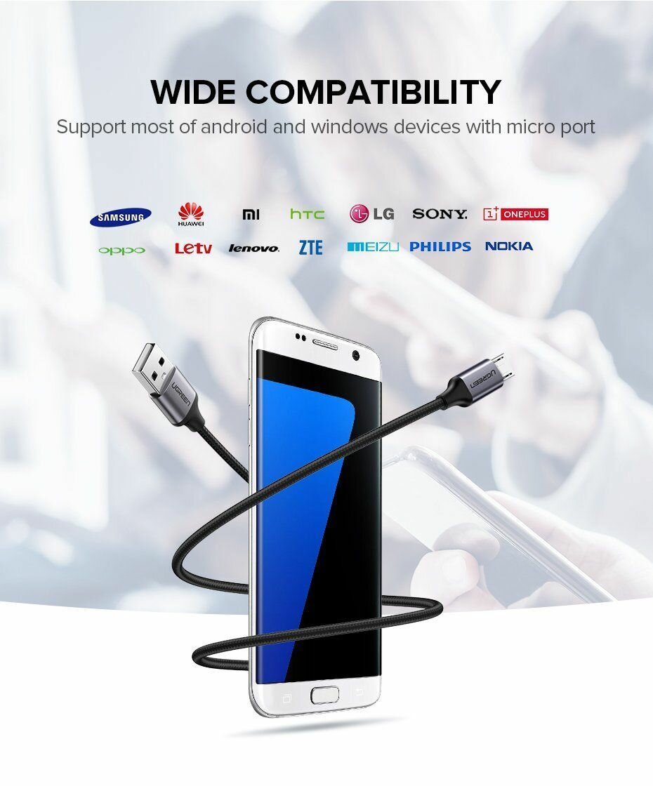 Кабель UGREEN US290 (60146) USB-A 2.0 to Micro-USB Cable Nickel Plating Alu Braid (1 метр) чёрный/серый