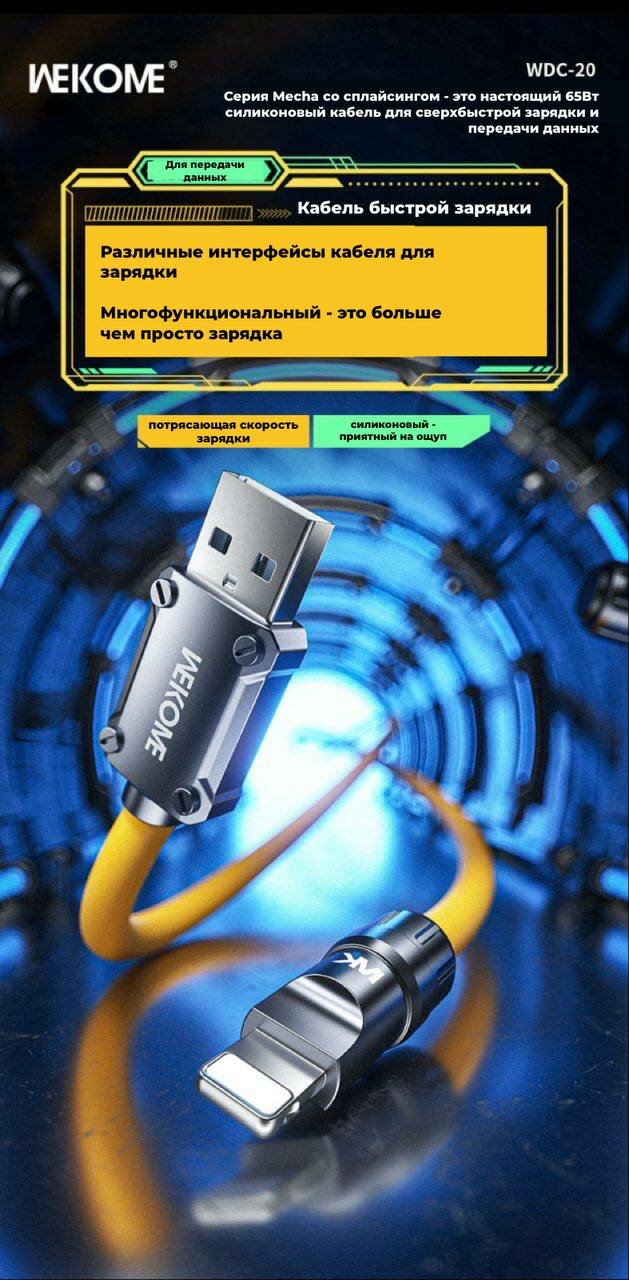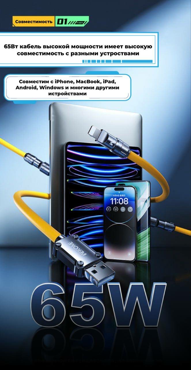 Кабель Type-C / Lightning / USB-A для быстрой зарядки iPhone / iPad / Android / iOS / Windows Wekome 65Вт интересное: